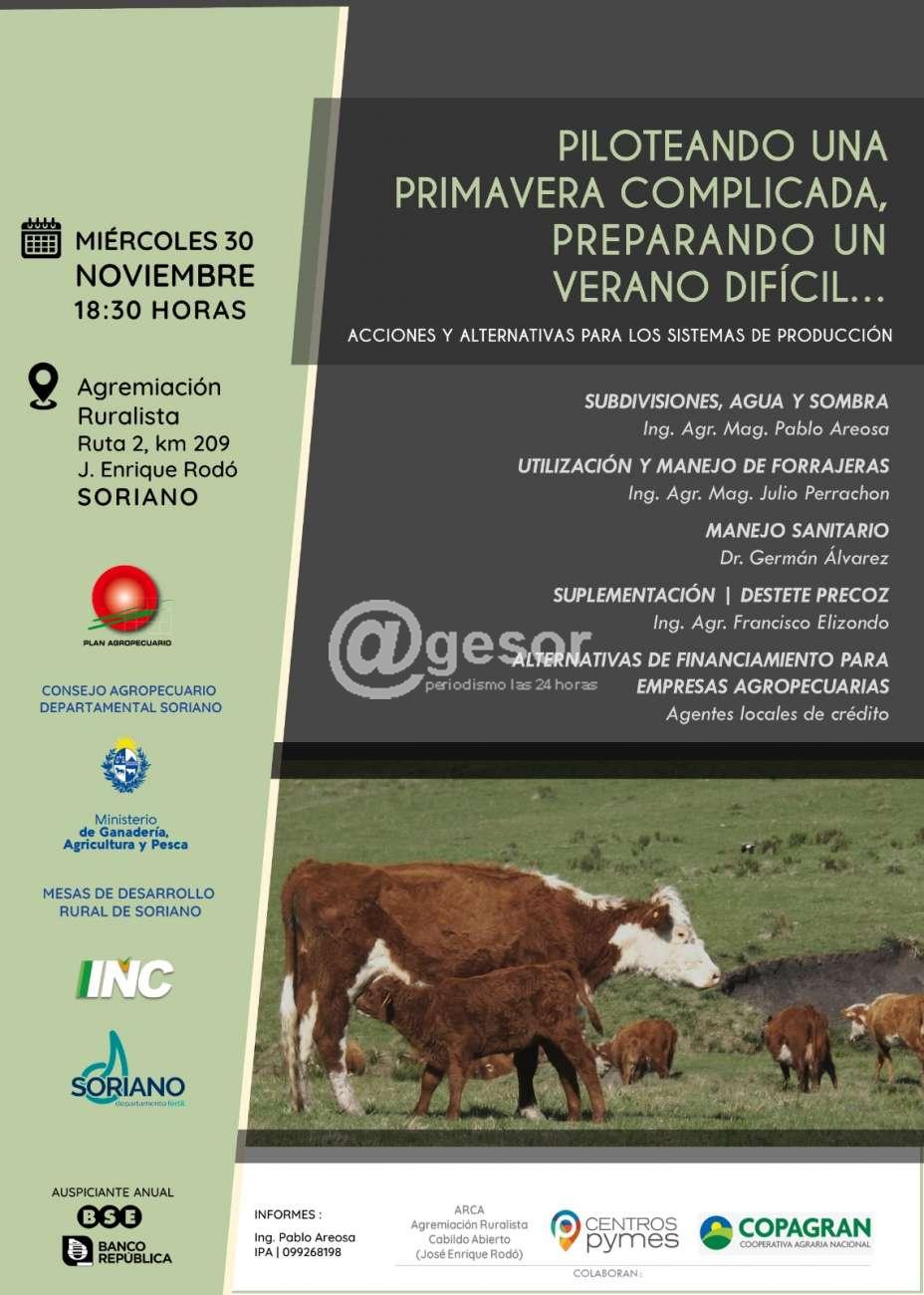 En la Agremiación Ruralista de José Enrique Rodó se realizará una reunión de la una Mesa de Desarrollo Rural unificada Soriano – Cardona. Será el miércoles 30 de noviembre, a partir de las 18,30 horas, bajo el título “Piloteando una primavera complicada, preparando un Verano difícil”. Una actividad organizada por el Consejo Agropecuario Departamental, el MGAP, INC, y la Intendencia de Soriano.