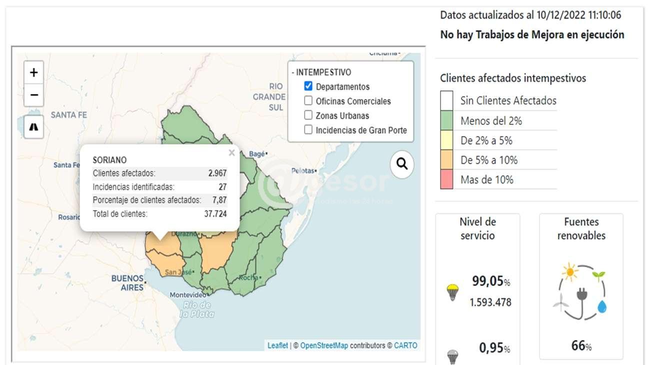 A esta hora son 2.967 clientes de UTE afectados por corte de energía eléctrica, producto de la situación climática producida en las últimas horas. En base a información proporcinada por el organismo a esta hora se están atendiendo 27 incidencias identificadas, significando una incidencia del 7,87% de los 37.724 clientes del departamento.