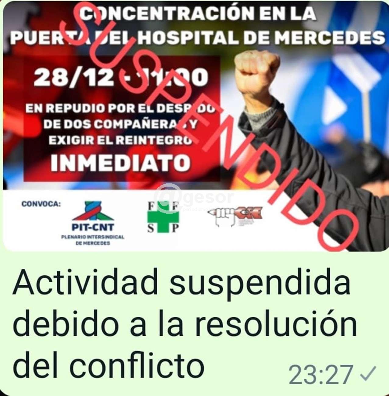 La movilización prevista para este miércoles por parte de los trabajadores para manifestarse frente a la puerta del Hospital Mercedes  “en repudio por el despido de dos compañeras y exigir el reintegro inmediato”, ha quedado suspendida.