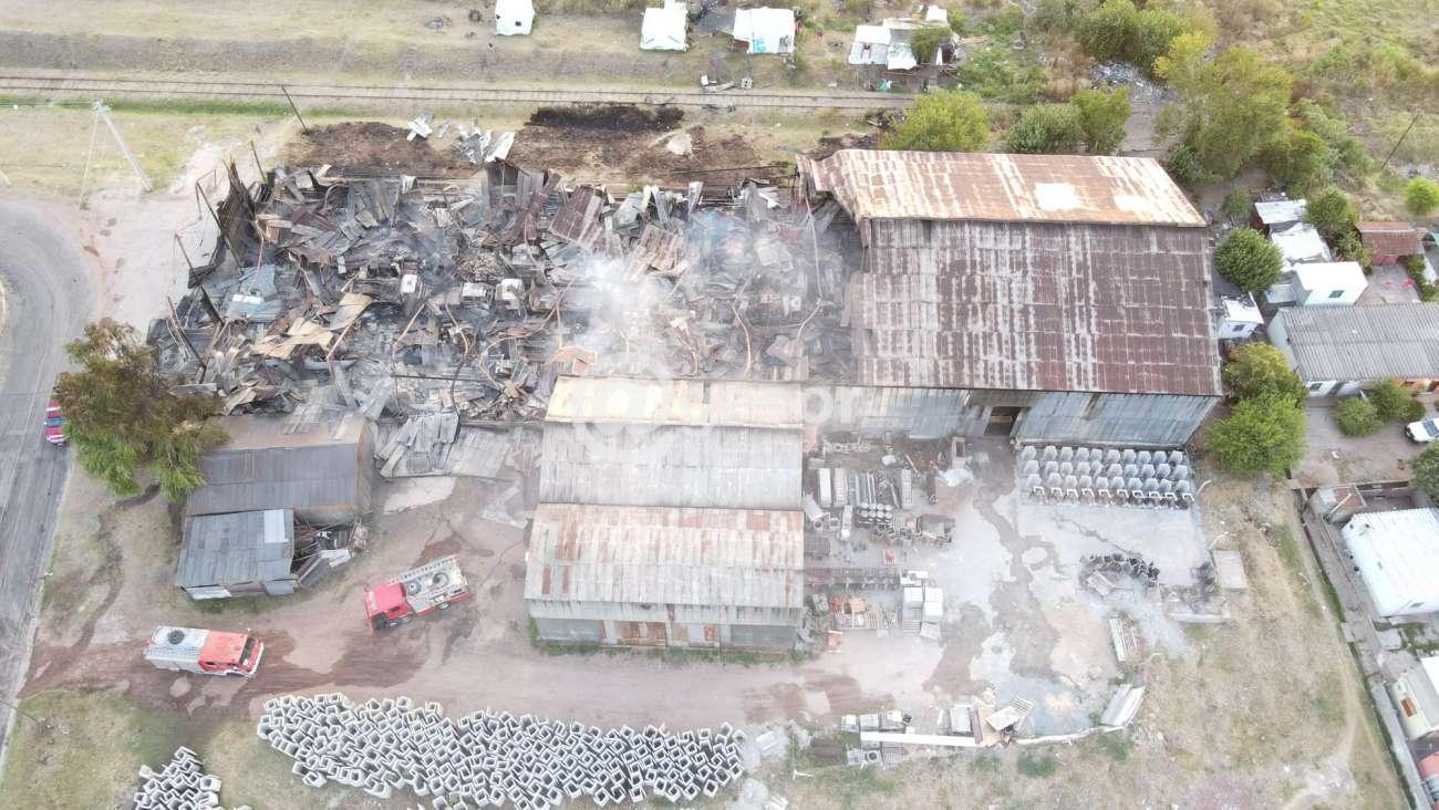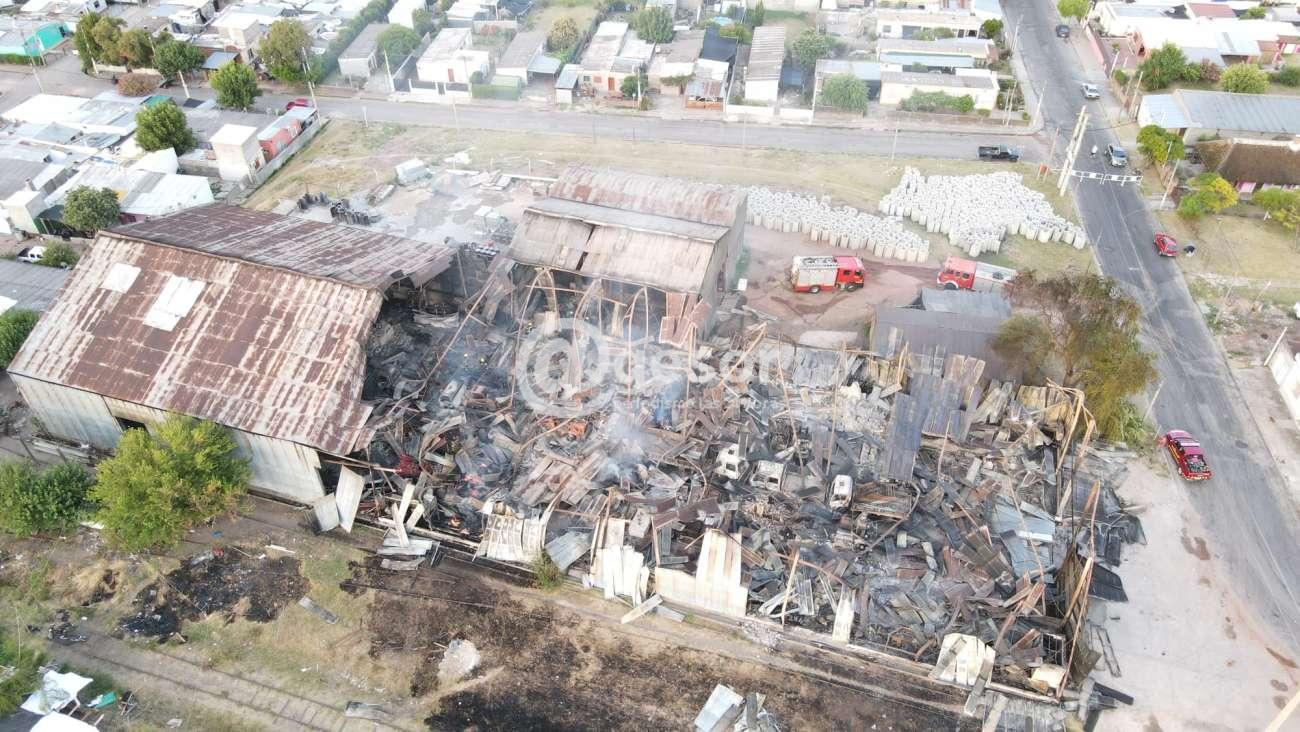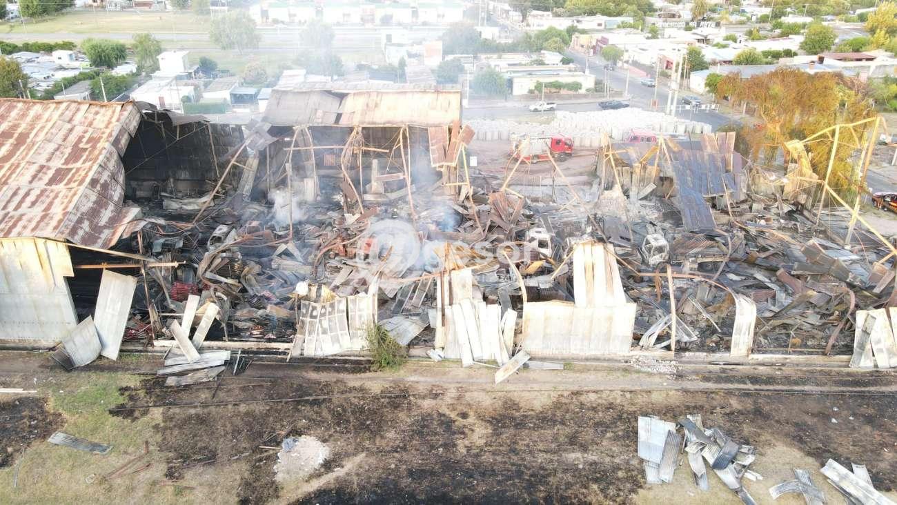 Las imágenes muestran la magnitud del desastre, en un lugar donde siguen trabajando los bomberos, y desde el aire es posible apreciar algunos de los camiones que se encontraban en el depósito, entre otros vehículos como detallamos en nota anterior.