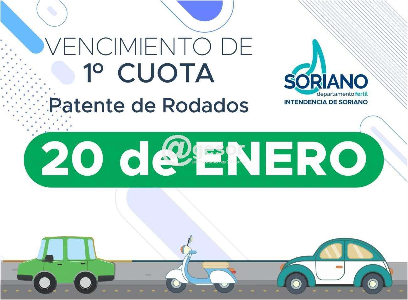 La Intendencia de Soriano recuerda que el viernes 20 de enero vence el plazo para pagar la 1ª cuota de la Patente de Rodados, así como también el pago contado anual de este tributo.Los pagos se pueden efectuar a través de la redes de cobranzas o a través de los medios habilitados por el SUCIVE.