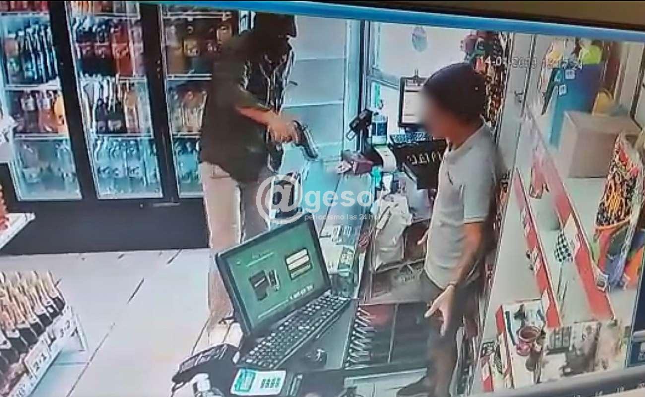 Personal actuante estableció como víctimas a masculino y femenina de 25 y 26 años, quienes manifestaron que se encontraban entregando el turno, momento en el que ingresa un NN portando un arma de fuego, el que agrede físicamente al masculino y exige que se le entregue dinero de las cajas registradoras, al notar que las mismas no contaban con el efectivo opta por sustraer a la femenina su mochila la que contenía un monedero color celeste, documentos varios, cuatro tarjetas electrónicas, juego de llaves, un recipiente tipo bol, un monedero de olor rosado, la suma de $ 1.500, un teléfono celular Redmi Note 7 y un par de lentes de protección solar, dándose posteriormente a la fuga con los objetos denunciados; avaluando los mismos en $ 25.000.
