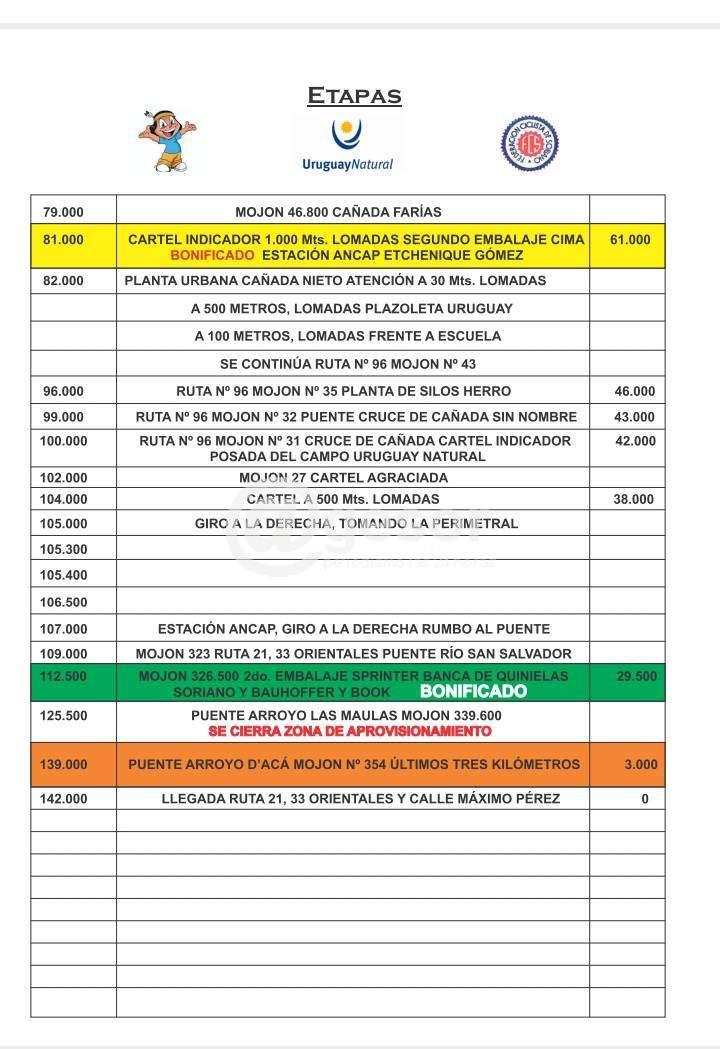 La concentración es a la hora 15.00 en el parque Cazeaux de Cardona, se sale a tren controlado por calle Lavalleja hasta Juana de Ibarbourou, en ésta se gira a la derecha hasta boulevard Cardona, en éste se gira a la derecha hasta calle Benavides, se gira a la izquierda hasta Ruta 12, se toma rotonda mano izquierda, para tomar Ruta 12, rumbo a Nueva Palmira, siendo la largada oficial en el mojón 106 de Ruta 12 Luis A. de Herrera, para recorrer 142,000 km.