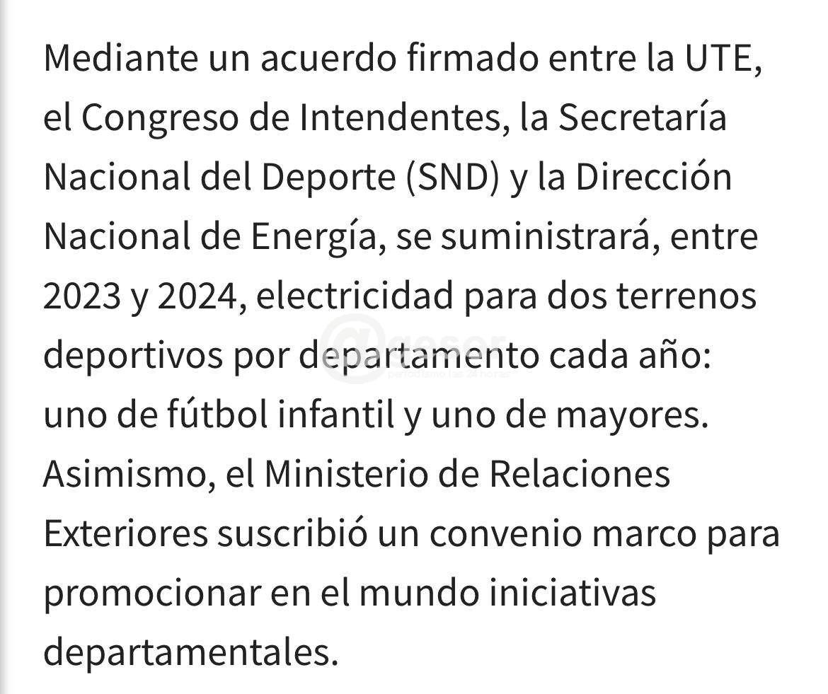 Con todo respeto a las personas que hacen La Cantina Radio en Dolores, aclaramos que votamos 3 millones de pesos (1 millón por año 22-23 y 24) en la Junta Departamental de Soriano para obras en el Parque Lavalleja de Dolores, el dinero está y se tienen que ejecutar, históricamente la Intendencia de Soriano como tiene que ser ha puesto dinero para el Lavalleja, nosotros lo aprobamos muy contentos en la JDS. Es imposible que la liga se niegue a estas mejoras que son para un bien común de todos los futboleros y ya se sabe desde que votamos el presupuesto que se tienen que llevar adelante. Es más en el 23 y 24 hay un plan de UTE con otras instituciones para mejorar la iluminación de muchos estadios del país donde está incluido nuestro departamento.