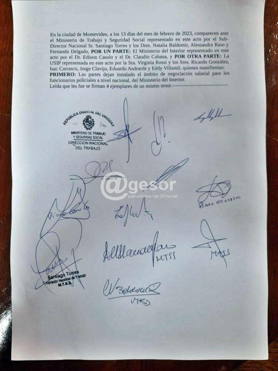 La USIP (Unión de Sindicatos Policiales) comunicó a @gesor que este lunes "se concurrió al MTSS manteniéndose una instancia tripartita entre el Ministerio del Interior (representado por los Dres. Edison Csulo y Claudio Cabana), Ministerio de Trabajo y Seguridad Social (representado por el Subdirector Nacional Dr. Santiago Torres y los Dres. Natalia Baldomir, Alessandra Raso y Fernando Delgado) y la USIP (como gremio representativo dentro del sector policial) representada por Ricardo González y Eduardo Andrade (Sifpom), Virginia Rossi (Afumi), Eddy Villamil (Aspoca y Sipolf), Issac Carrasco y Jorge Clavijo (Supu), lográndose en forma histórica, firmar bajo acta, la instalación del ámbito de negociación salarial permanente y exclusivo para los funcionarios policiales a nivel nacional del Ministerio del Interior.