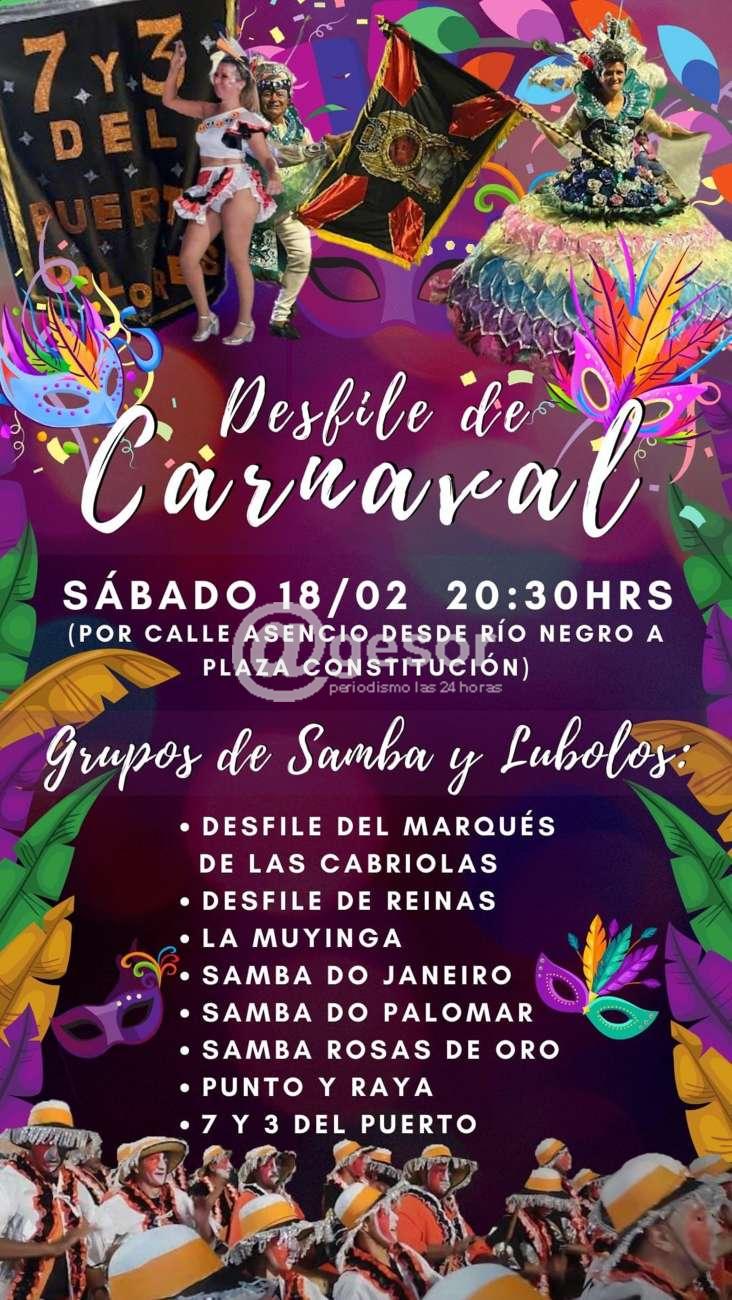 Las celebraciones del Carnaval de Soriano tendrán su epicentro este sábado en Dolores con un gran desfile de agrupaciones de samba y lubolos, además del marqués de las Cabriolas y la Reina del Carnaval y su séquito.