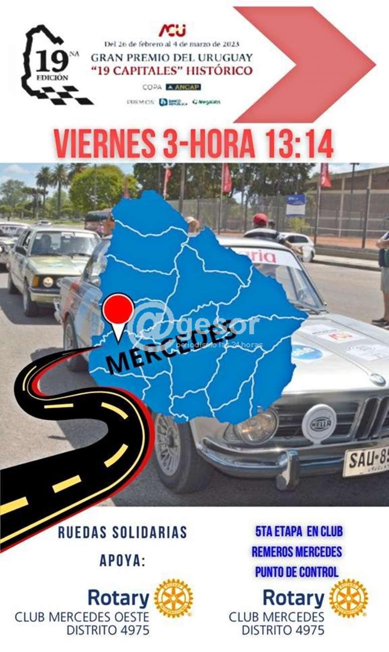 En este nota ofrecemos el recorrido por Mercedes, cuando ingrese la caravana que pasará por la capital sorianense y recibirán los coches los controles por los Rotary Mercedes y Mercedes Oeste, frente al Banco República en Colón y De Castro y Careaga a partir de las 13.14 horas, y posteriormente continuarán los vehículos rumbo a Colonia punto de llegada, pasando previamente por Dolores a las 13.47 horas.