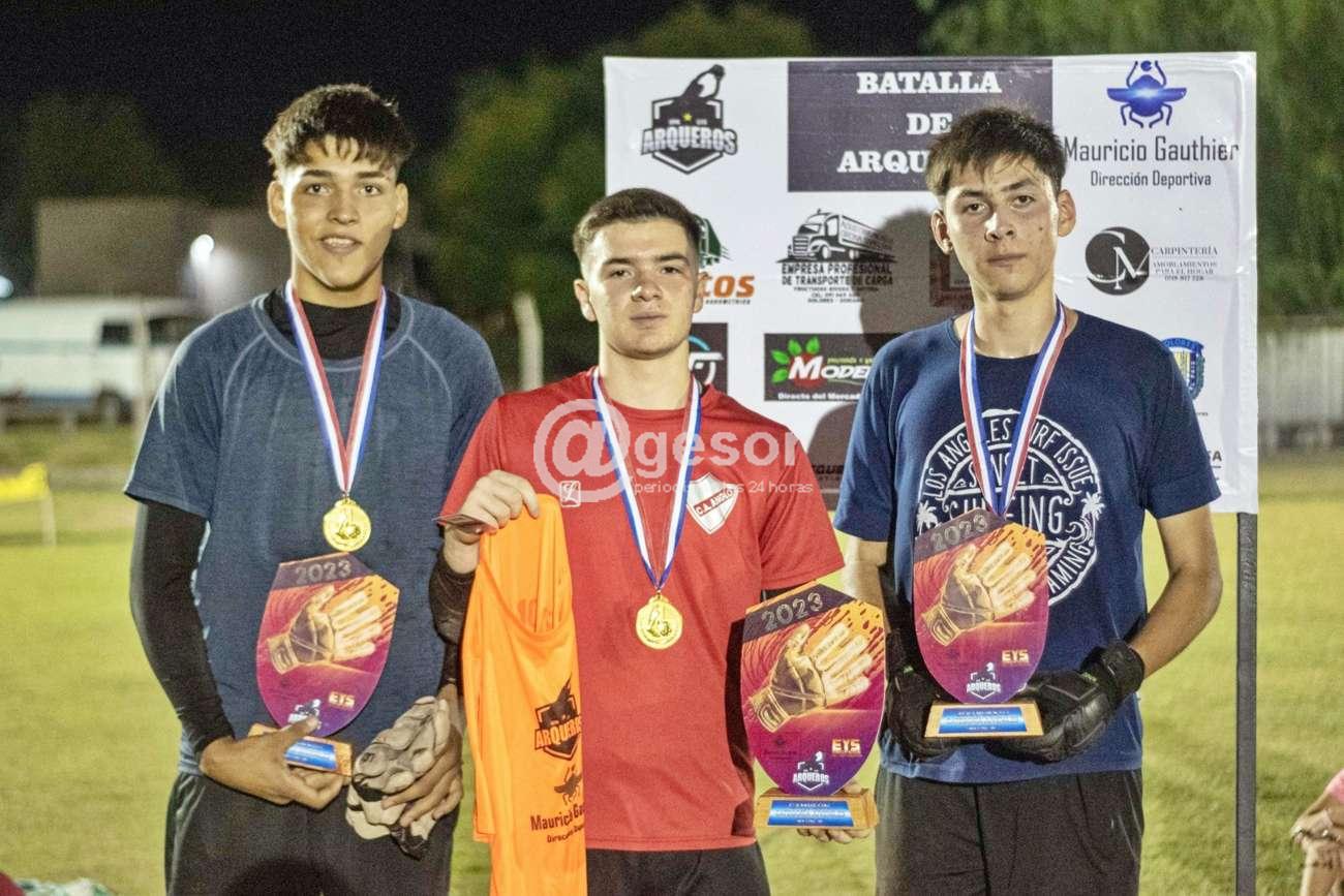 Enzo Arballo y Martín Aranguren con guantes, Mateo Machado con pantalón de arquero.