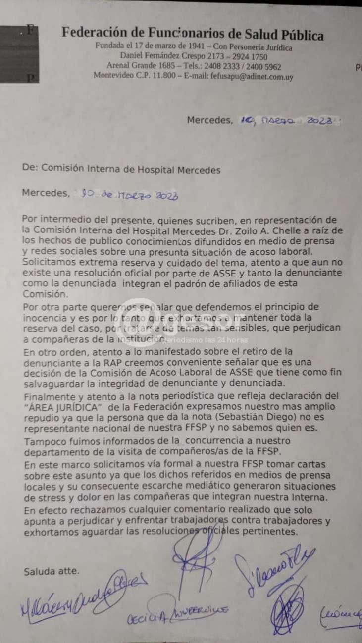 Por intermedio de la presente, quienes suscriben, en representación de la Comisión Interna del Hospital Mercedes Dr. Zoilo A. Chelle a raíz de lo hechos de público conocimiento difundidos en medio de prensa y redes sociales sobre una presunta situación de acoso laboral. Solicitamos extrema reserva y cuidado del tema, atento a que aun no existe una resolución oficial por parte de ASSE y tanto la denunciante como la denunciada integran el padrón de afiliados de esta Comisión.