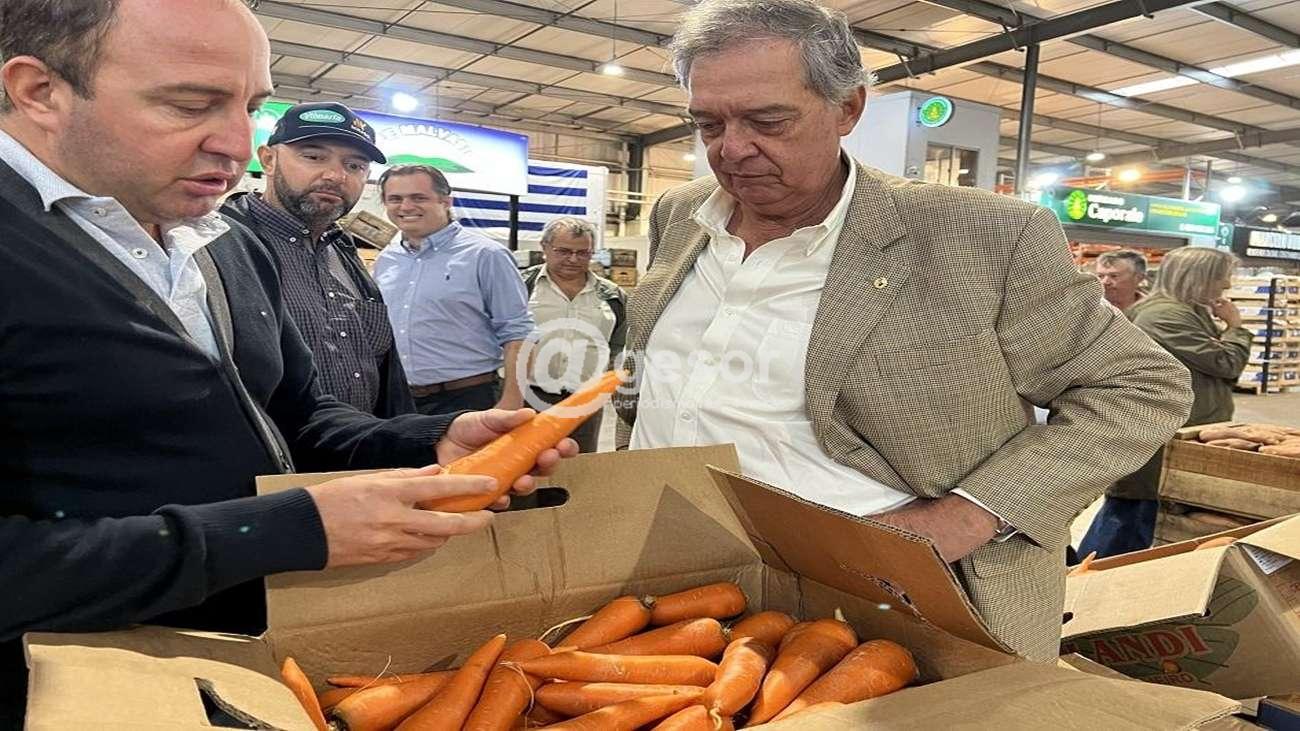 El ministro Fernando Mattos, el subsecretario, Ignacio Buffa y el director de DIGEGRA, Nicolás Chiesa, recorrieron la Unidad Agroalimentaria Metropolitana, evaluando el impacto de la medida excepcional que promueve la importación de zanahoria por parte de productores.