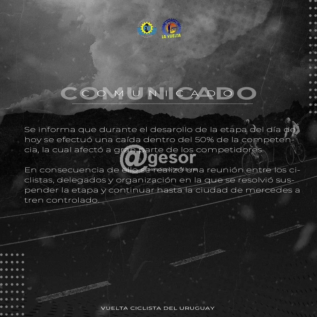 En consecuencia de ello se realizó una reunión entre los ciclistas, delegados y organización en la que se resolvió suspender la etapa y continuar hasta la ciudad de Mercedes a tren controlado”.