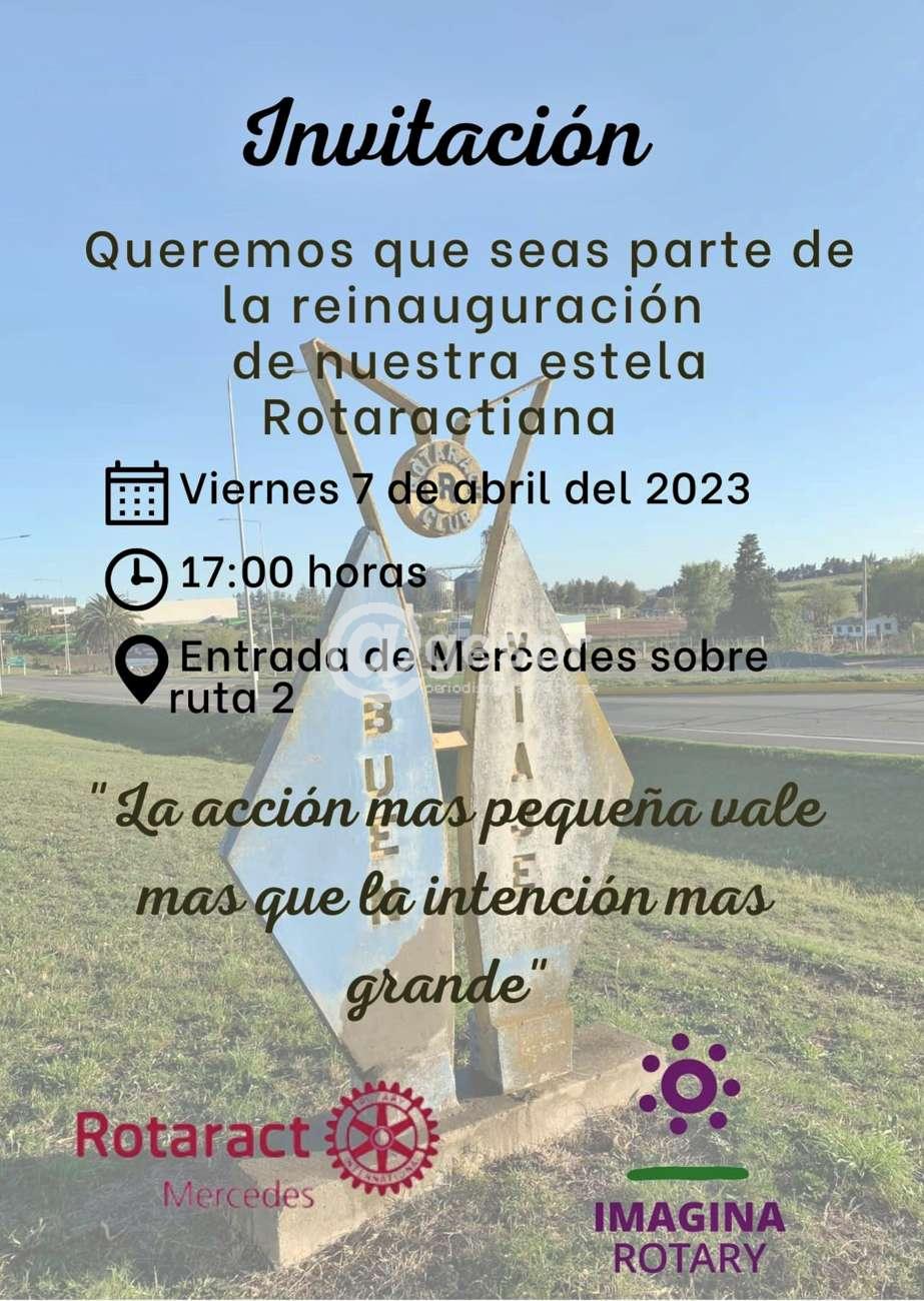 El Club Rotaract de Mercedes está invitando a la reinauguración de la estela rotaractiana que se ubicará en Ruta 2 al este frente a estación Ancap de Echenique en los accesos de la capital sorianense.