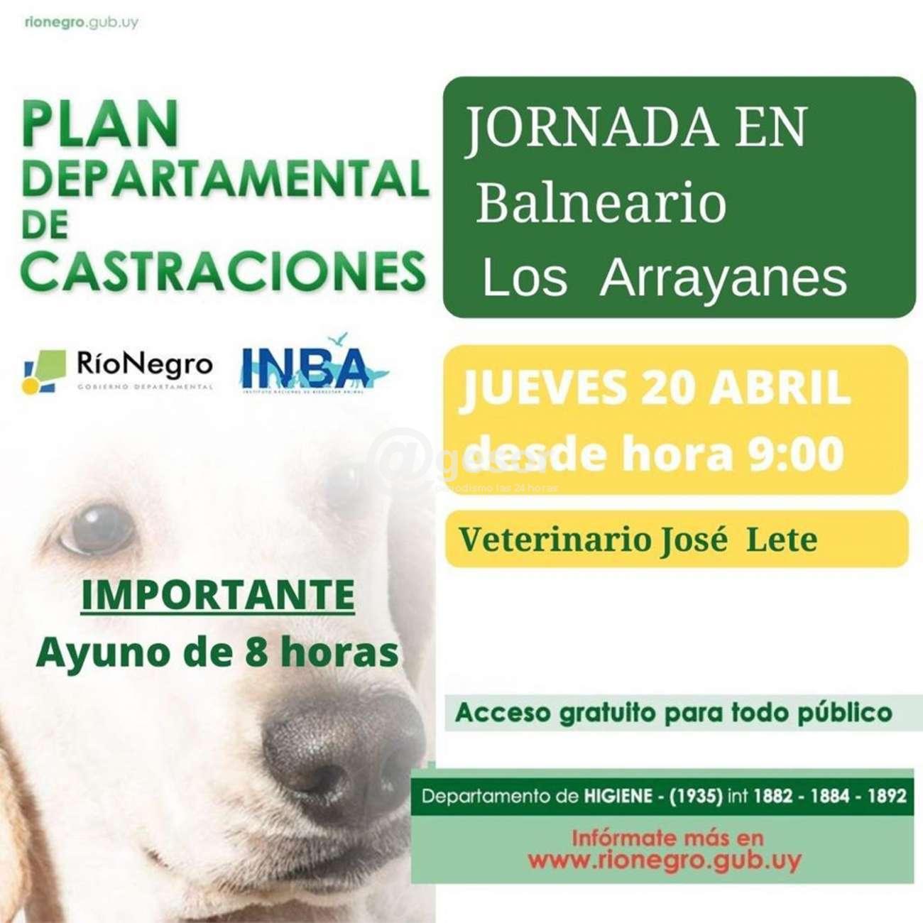 El Plan departamental de castraciones instrumentados entre el INBA y la Intendencia de Río Negro desarrollará una jornada de castraciones en el balneario Los Arrayanes. Será este jueves 20 de abril a partir de las 9 hoas, a cargo de Veterinario José Lete.