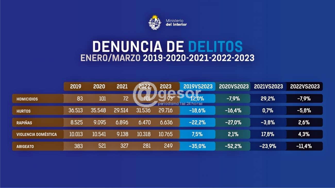 Con datos del Observatorio Nacional sobre Violencia y Criminalidad, el Ministerio del Interior brinda los datos de homicidios, rapiñas, hurtos, denuncias de violencia doméstica y abigeatos del primer trimestre de 2023 del gobierno presidido por Luis Lacalle Pou.