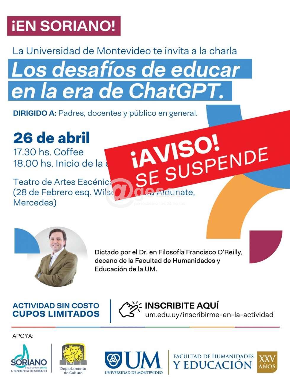 Por causas de fuerza mayor, la Universidad de Montevideo deberá suspender la charla de hoy 26 de abril en la ciudad de Mercedes, titulada “Los desafíos de educar en la era de ChatGPT”.