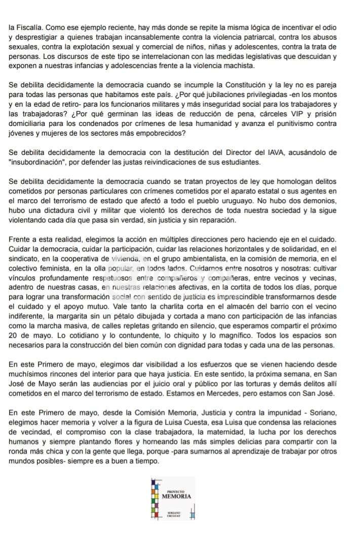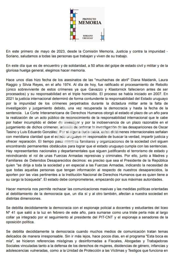 Rita Cabrera tuvo a su cargo la lectura de la proclama de la Comisión Memoria, Justicia y Contra la impunidad de Soriano. Recordando que “hay representantes nacionales y departamentales que siguen justificando el terrorismo de estado y reivindicando el rol de unas Fuerzas Armadas represivas y criminales”.