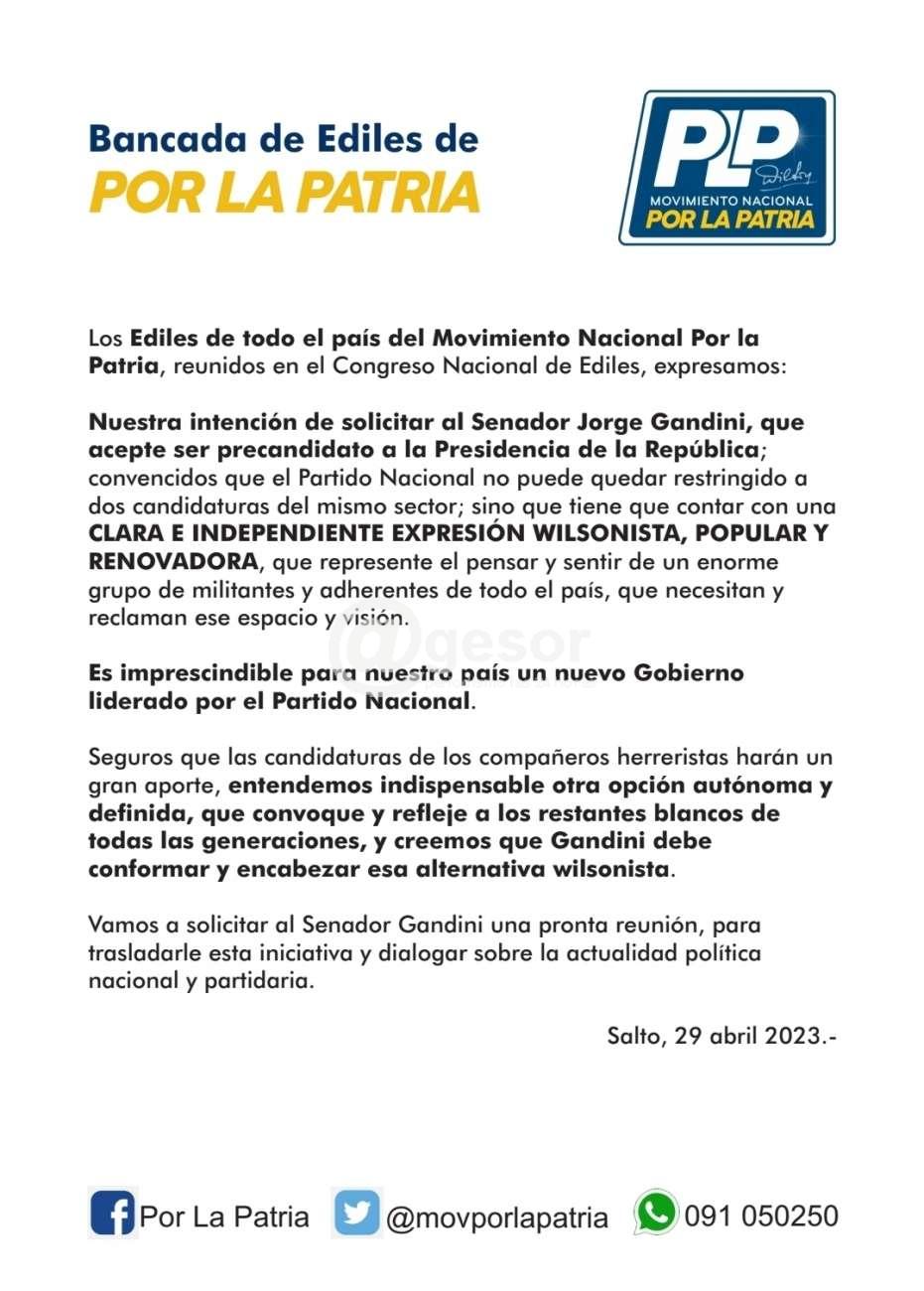 "Convencidos que el Partido Nacional no puede quedar restringido a dos candidaturas del mismo sector; sino que tiene que contar con una CLARA E INDEPENDIENTE EXPRESIÓN WILSONISTA, POPULAR Y RENOVADORA" expresaron en un comunicado.