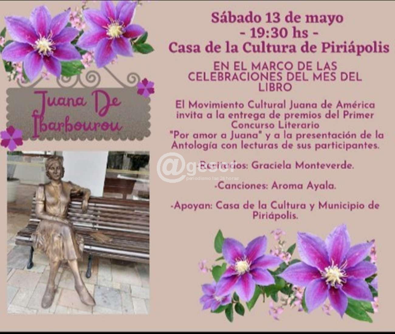 El sábado 13 de mayo en Casa de la Cultura de Piriápolis, en el marco de las celebraciones del Mes del Libro, el Movimiento Cultural Juana de América, está invitando a la entrega de premios del Primer Concurso Literario "Por amor a Juana" y a la presentación de la Antología con lecturas de sus participantes.