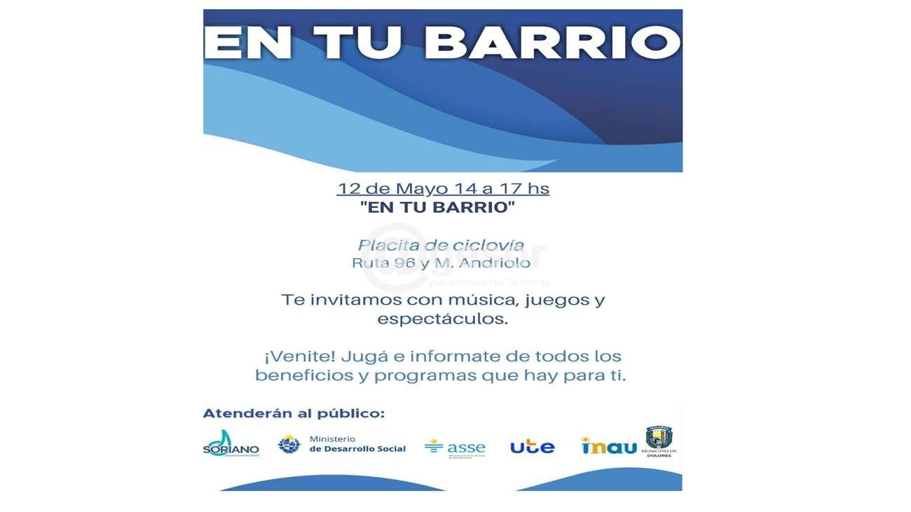 El programa En tu barrio impulsado por el MIDES, INAU, la Intendencia de Soriano, ASSE y UTE llegará el viernes 12 demayo a Dolores. La actividad se realizará de 14 a 17 horas, en Placita de ciclovía (Ruta 96 y M.Andriolo). Habrá música, juegos y espectáculos, enuna actividad abierta a todo público.