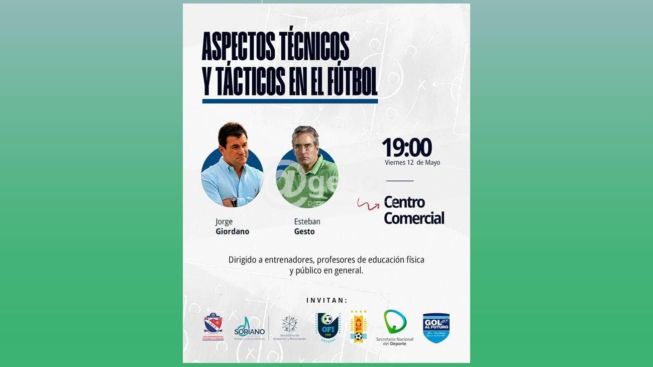 "Aspectos técnicos y tácticos en el fútbol" será el título de la charla que brindarán Esteban Gesto y Jorge Giordano. La actividad es organizada por la Liga Departamental de Fútbol de Soriano con el apoyo de la Intendencia de Soriano, OFI, AUF, la Secretaría Nacional de Deportes y Gol al futuro. Será este viernes 12 de mayo a partir de las 19 horas. Estando dirigida a entrenadores, profesores de educación física y público en general.