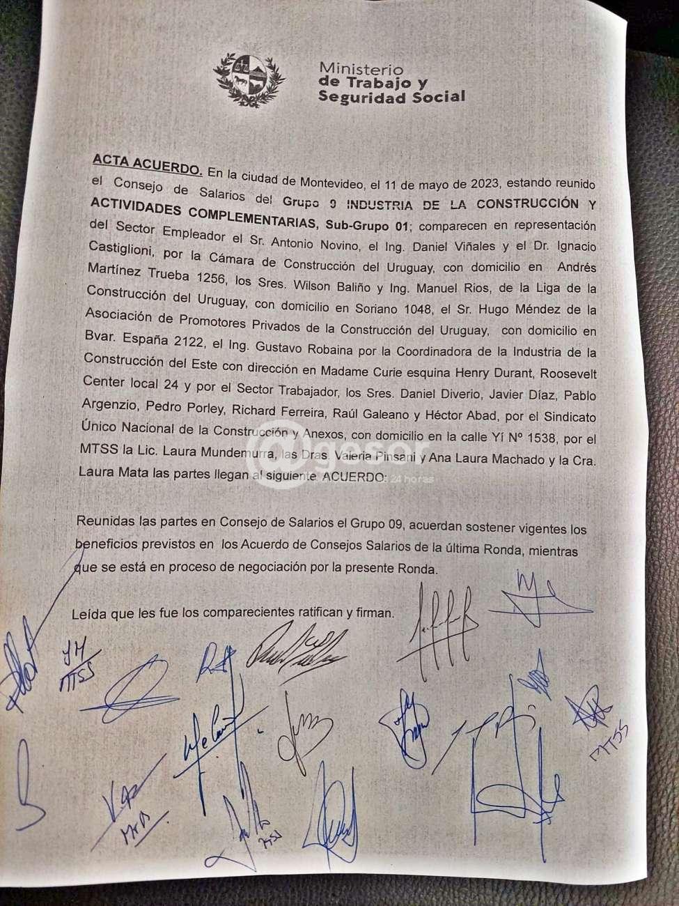 Este jueves se reunió el Consejo de Salarios del Grupo 9 Industria de la Construcción y Actividades Complementarias, Sub Grupo 01, ocasión en la que comparecieron representantes de la Cámara de la Construcción del Uruguay, de la Liga de la Construcción del Uruguay, de la Asociación de Promotores Privados de la Construcción del Uruguay, de la Coordinadora de la Industria de la Construcción del Este, y del SUNCA, así como también del Ministerio de Trabajo, quienes arribaron al acuerdo de "sostener vigentes los beneficios previstos en los Acuerdos de Consejos Salarios de la última Ronda, mientras que se está en proceso de negociación por la presente Ronda".