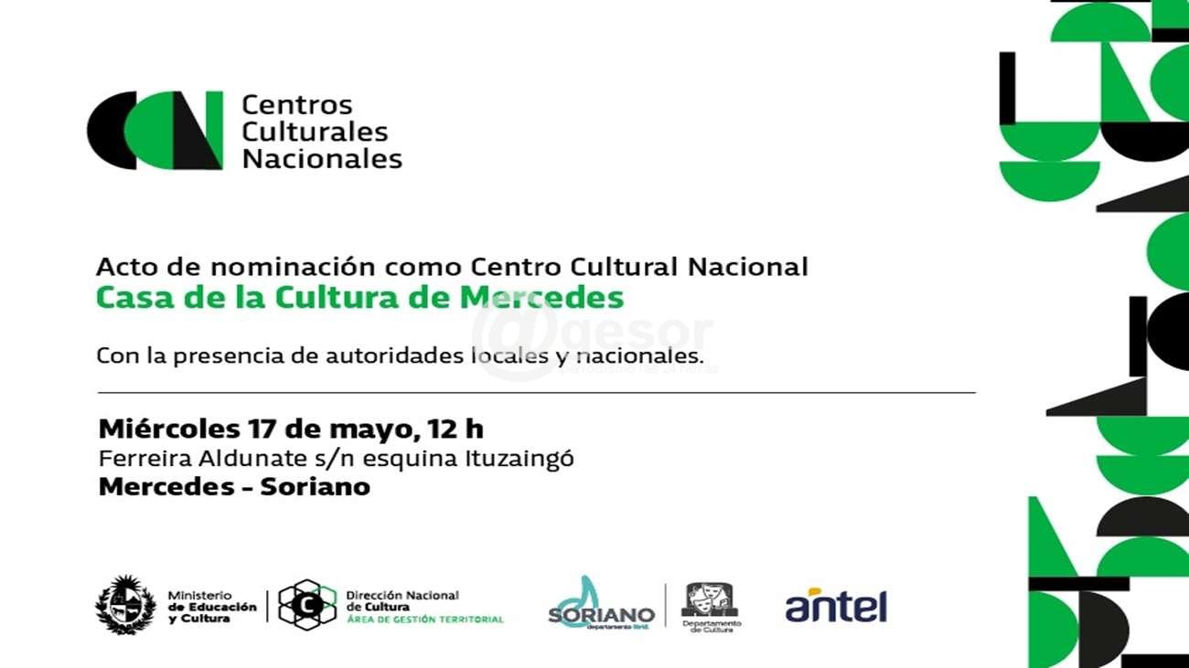 Soriano contará con su segundo Centro Cultural Nacional, ya que la actual Casa de la Cultura de Mercedes pasará a tener esa denominación. El primero fue inaugurado en Dolores el año pasado, por lo que con estos dos centros posibilitará al departamento a contar con otra dinámica en la circulación de propuestas culturales, tanto de las que se generen en Soriano como las que puedan llegar de otros departamentos.