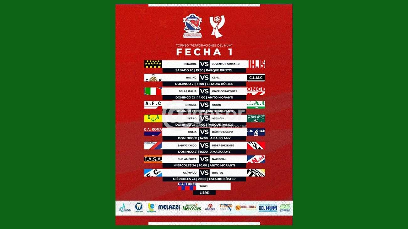 El día sábado comienza el torneo con el partido en cancha de Bristol entre Peñarol vs Juventud Soriano a la hora 19 y 30, mientras que el domingo hora 11 en el Estadio Koster juegan para la TV Racing vs CLMC. En la tarde juegan Bella Italia vs Once Corazones a la hora 14 en el Anito Moranti y a la hora 16 lo hacen Artigas vs Unión-. En Parque Ramos juegan a la hora 14 Ferrocarril vs Asencio. En el renovado Amalio Amy juegan hora 14 Roma vs Barrio Nuevo y a la hora 16 lo hace Sandú vs Independiente. EL próximo miércoles jugarán hora 20 en Anito Moranti Nacional vs IASA y en el Koster lo hará Olímpico vs Bristol. Estos dos partidos se juegan entre semana en virtud que tanto Bristol como Nacional juegan el Torneo de OFI.