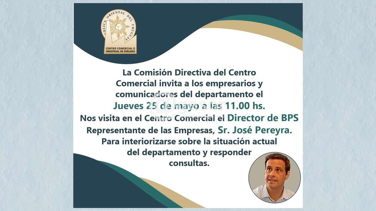 El Centro Comercial e Industrial de Soriano convoca a empresarios y comerciantes del medio para este jueves 25 de mayo, a las 11 horas, a una reunón con el director del BPS en representación de los Empresarios. José Pereira estará llegando a Mercedes para esta instancia de intercambio donde se dialogará sobre la situación actual del departamento en la coyuntura económica que viene atravesando el país.