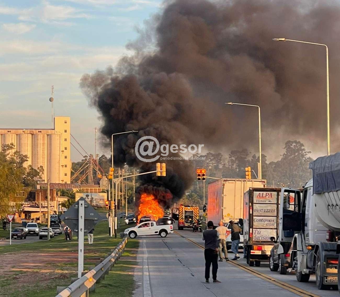 En la tarde de este jueves se produjo foco ígneo en vehículo que circulaba por Ruta 2 de Sur a Norte, casi a la altura de calle Rivas, y que por causas que se procuraban establecer por Bomberos, tomó fuego, quemándose la mayor parte del mismo