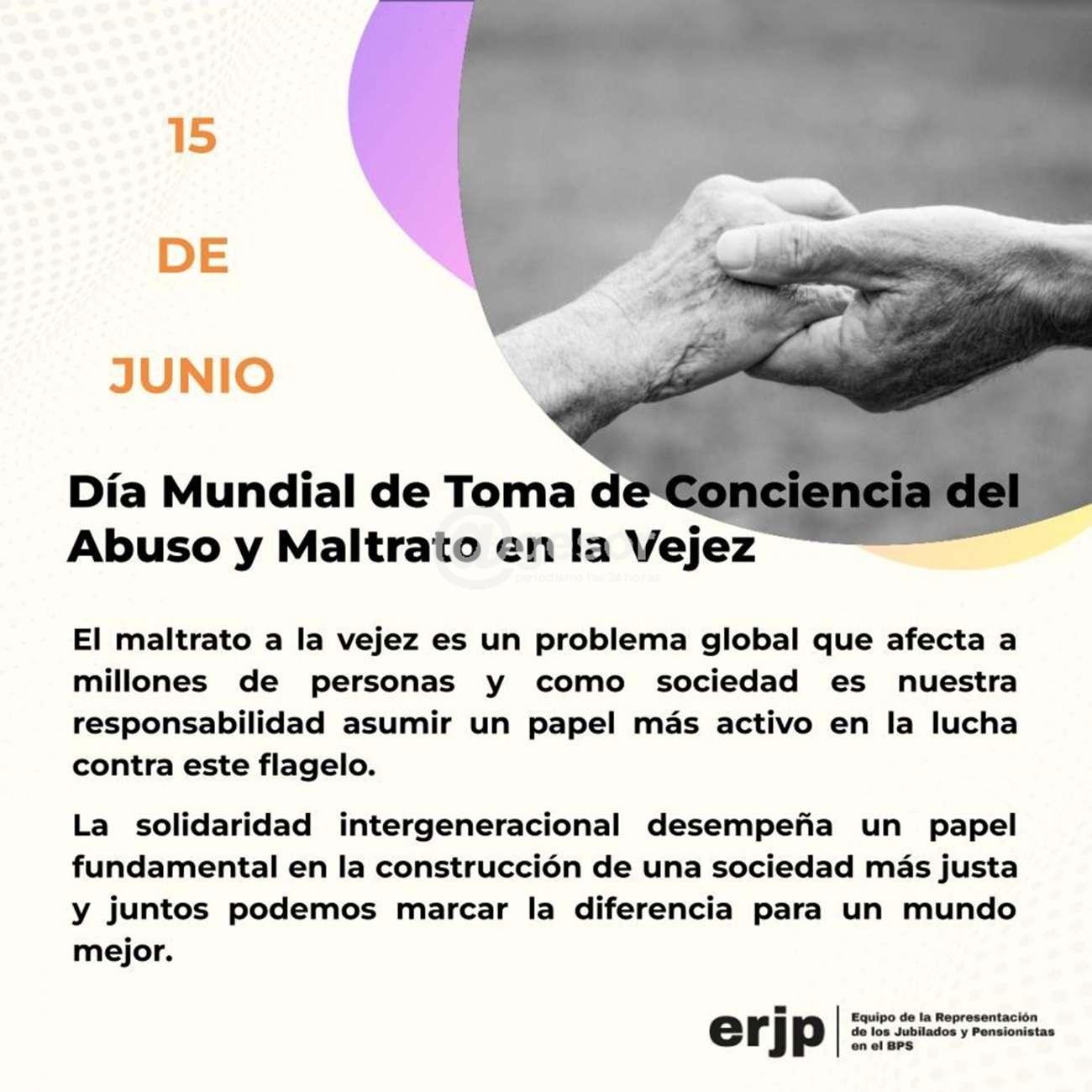 El Equipo de la Representación de los Jubilados y Pensionistas en el BPS se adhiere a la conmemoración del Día Mundial de Toma de Conciencia del Abuso y Maltrato en la Vejez, declarado por la Asamblea General de las Naciones Unidas en 2011 y se conmemora este 15 de junio.