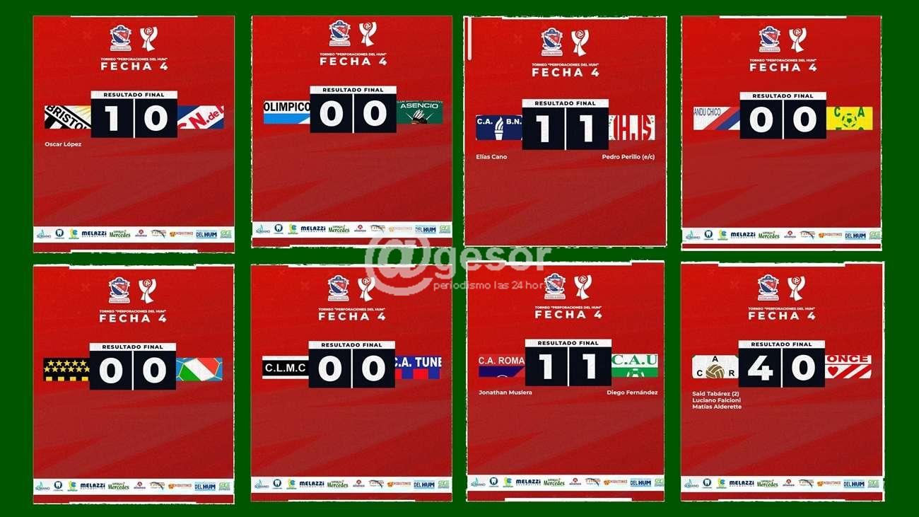Cuatro empates  y apenas  9  goles  se marcaron en la  cuarta fecha del  torneo “Perforaciones del Hum”  del fútbol mercedario.