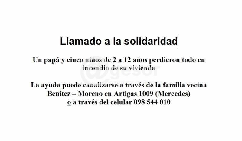 Se recurre a la solidaridad de la comunidad de Mercedes para ayudar a esta familia, pudiendo hacerlo en la casa de la familia vecina Benítez - Moreno en Artigas 1009 o a través del cel. 098 544 010.
