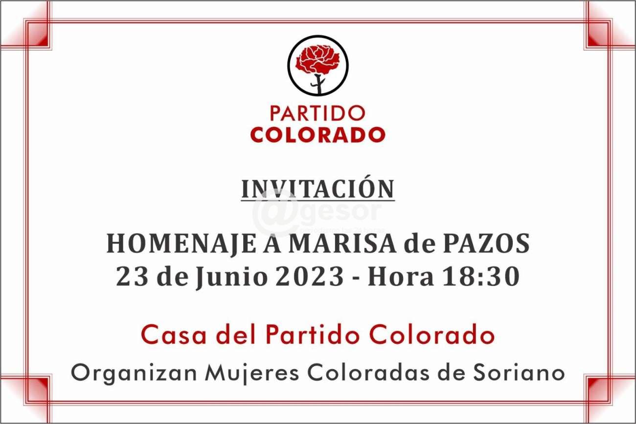 Este viernes 23 de junio en Casa del Partido Colorado de Soriano (de Castro y Careaga entre Colón y 18 de Julio), con la organización de Mujeres Coloradas de Soriano, se lleva a cabo homenaje a la recordada militante y dirigente de esta colectividad, Marisa de Pazos.