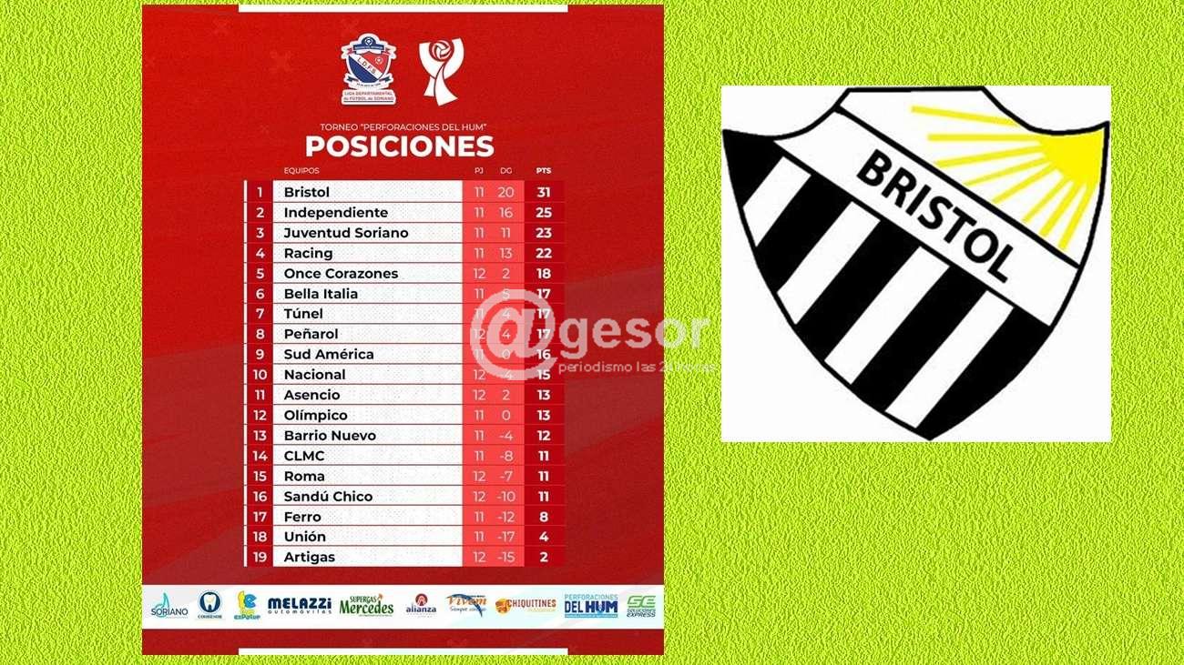 Bristol volvió a ganar este domingo y sigue con comodidad al frente de la tabla del fútbol mercedario. La 12ª fecha marcó que Bristol aventaja por seis puntos al segundo (Independiente), y se ubica a 8 puntos del tercero (Juventud Soriano); en un campeonato que lo viene teniendo como claro líder.