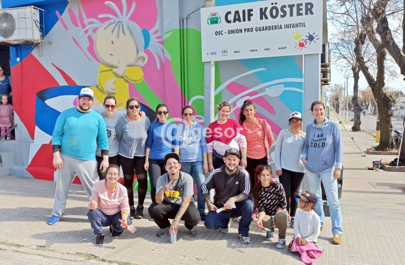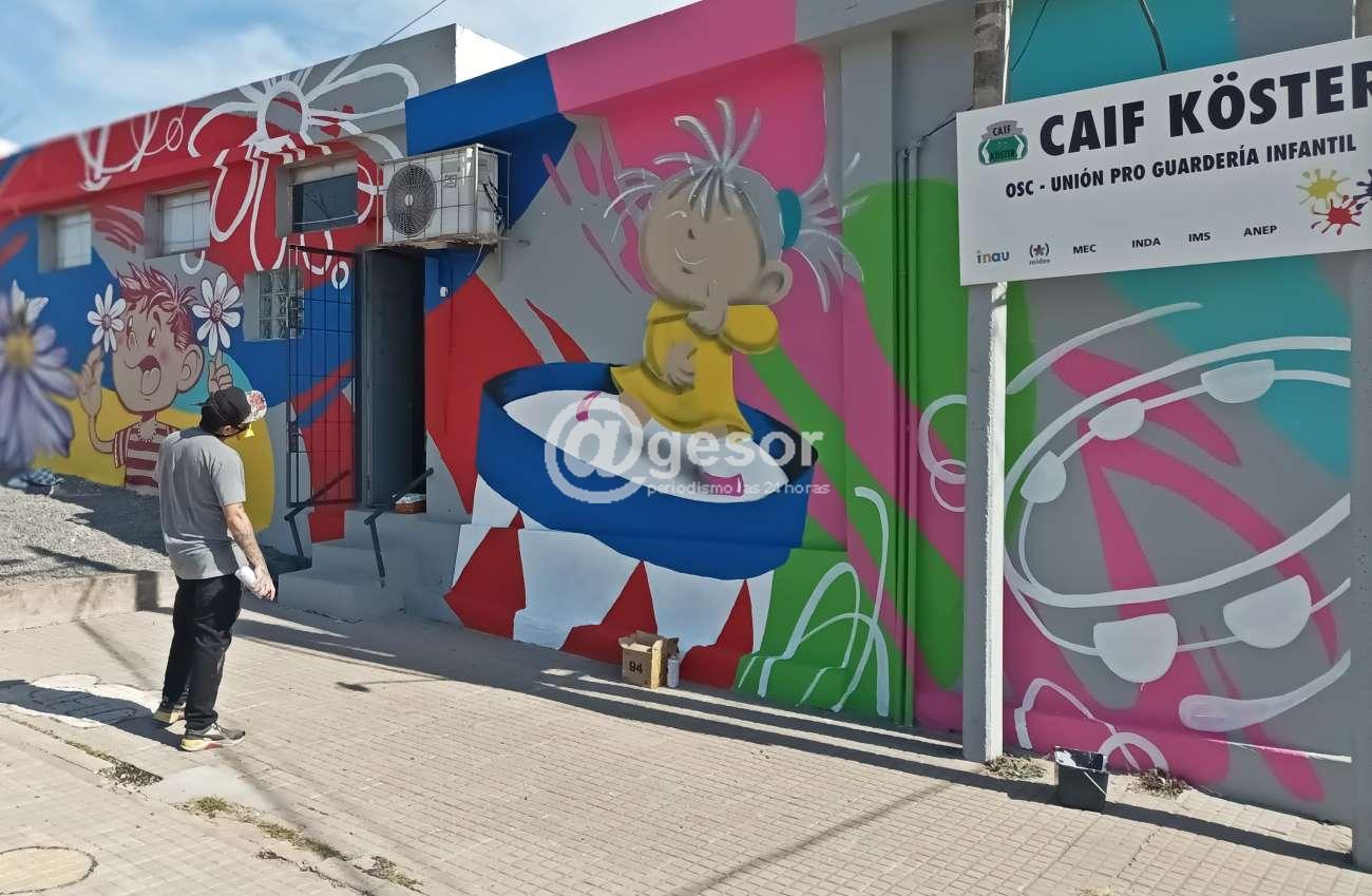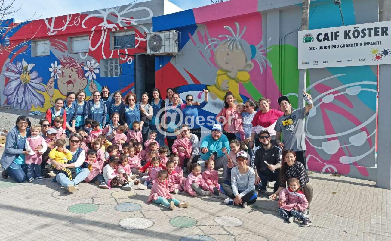 El CAIF Köster ubicado en la esquina de Herrero y Espinosa y avda. Fregeiro que es administrado por la OSC Unió Pro Guardería Infantil, que este año está celebrando los 35 años del Plan CAIF y de la creación de este centro, está cobrando un particular colorido, gracias al trabajo en conjunto que llevan adelante dos artistas plásticos como Niko Castro y Juani Pomi guiando a madres y padres en la pintura del muro exterior del frente del centro, tras ideas surgidas entre las maestras y educadoras, junto a los técnicos y todo el equipo de cocina y limpieza, guiados por los artistas, quedando reflejadas las diferentes etapas por la que pasa el niño desde que ingresa hasta que sale del CAIF y con un colorido muy llamativo, que le da una vida especial a toda esa zona.