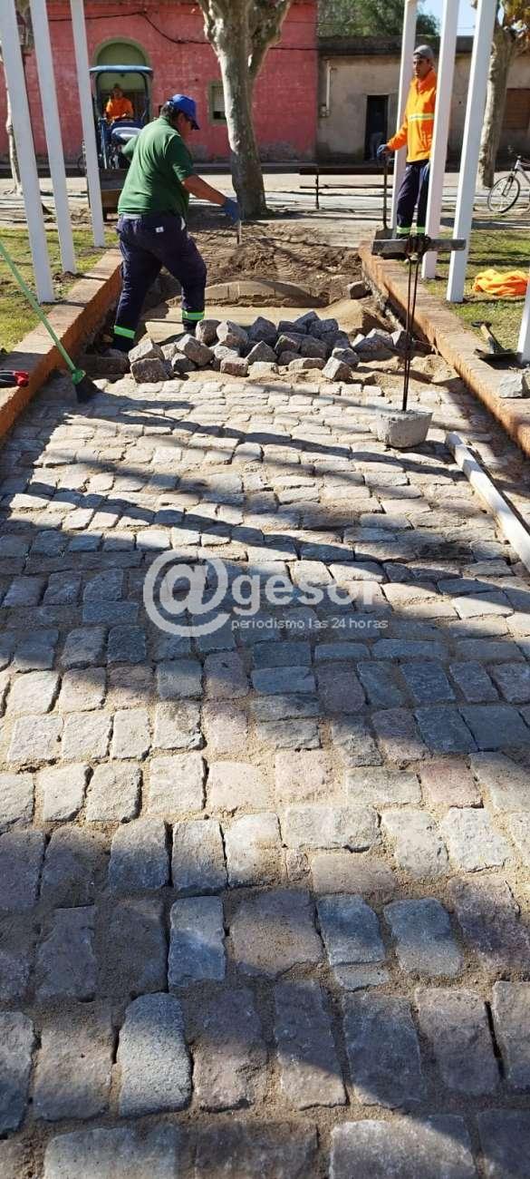 Asimismo se colocan adoquines en la vereda situada debajo de la pérgola, logrando con este pavimento en piedra una mayor transitabilidad y agregando un toque colonial a la plaza que tiene su valor patrimonial.
