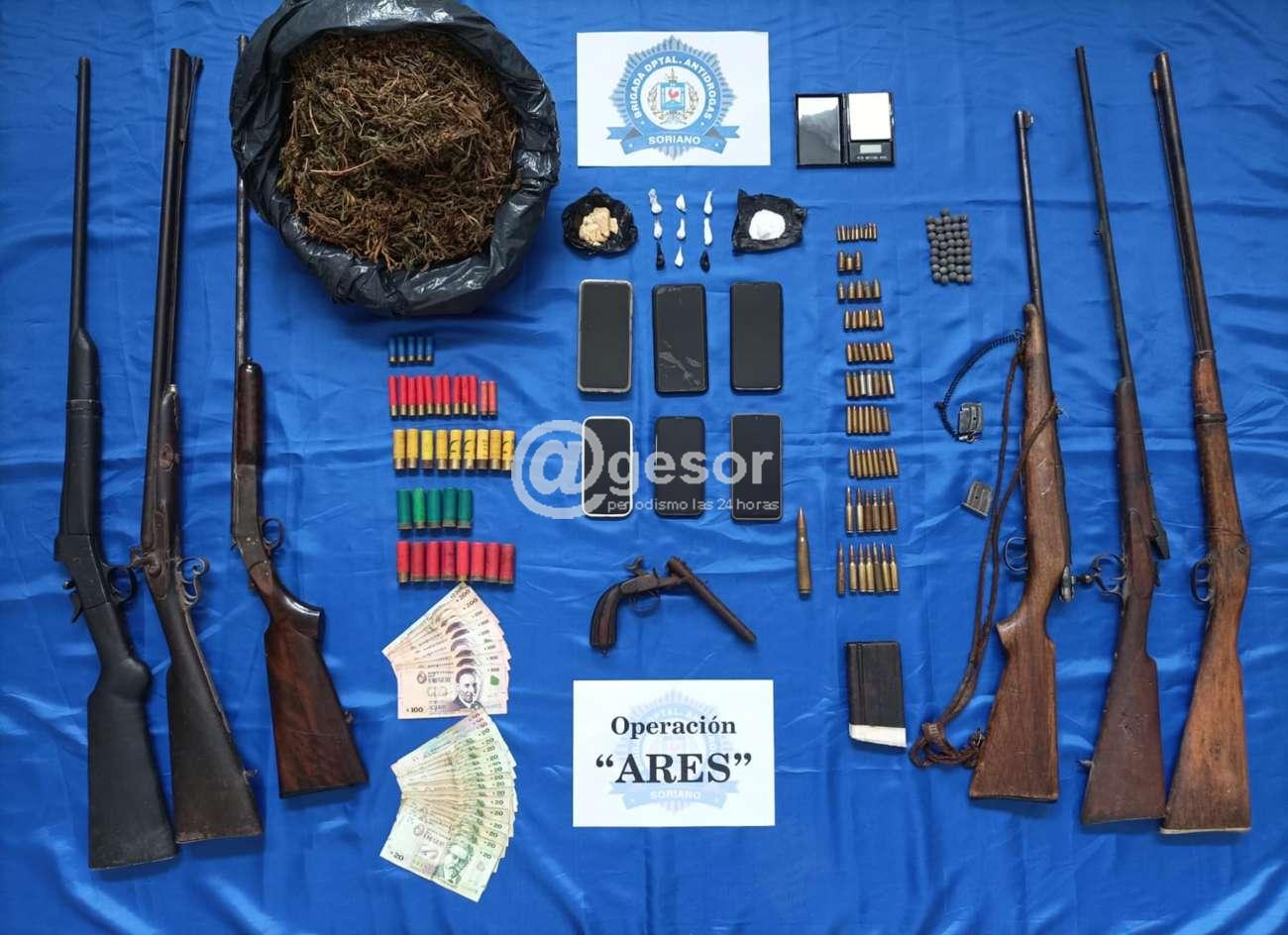Siendo el viernes 18 de agosto del 2023 se realizaron siete allanamientos en fincas ubicadas en distintos puntos de la ciudad de Mercedes, como así también en Cardona, Florencio Sánchez e Ismael Cortinas, dicho procedimiento fue llevado a cabo por la Brigada Departamental Antidrogas, con el apoyo de Grupo de Reserva Táctica (G.R.T), Área de Investigaciones de Zona 3 y Unidad K – 9, logrando así la detención de cuatro masculinos y tres femeninas todos mayores de edad y a su vez la incautación de nueve envoltorios conteniendo sustancia blanca símil cocaína, sustancia en piedra color ocre símil pasta base, 1846 gramos de sustancia vegetal símil marihuana, una balanza de precisión, cinco teléfonos celulares, dinero en efectivo por la suma de $ 3.450, un rifle calibre 22, cinco escopetas de diferentes calibres, una pistola, cartuchos varios de diferentes calibres y una camioneta Volkswagen Saveiro.