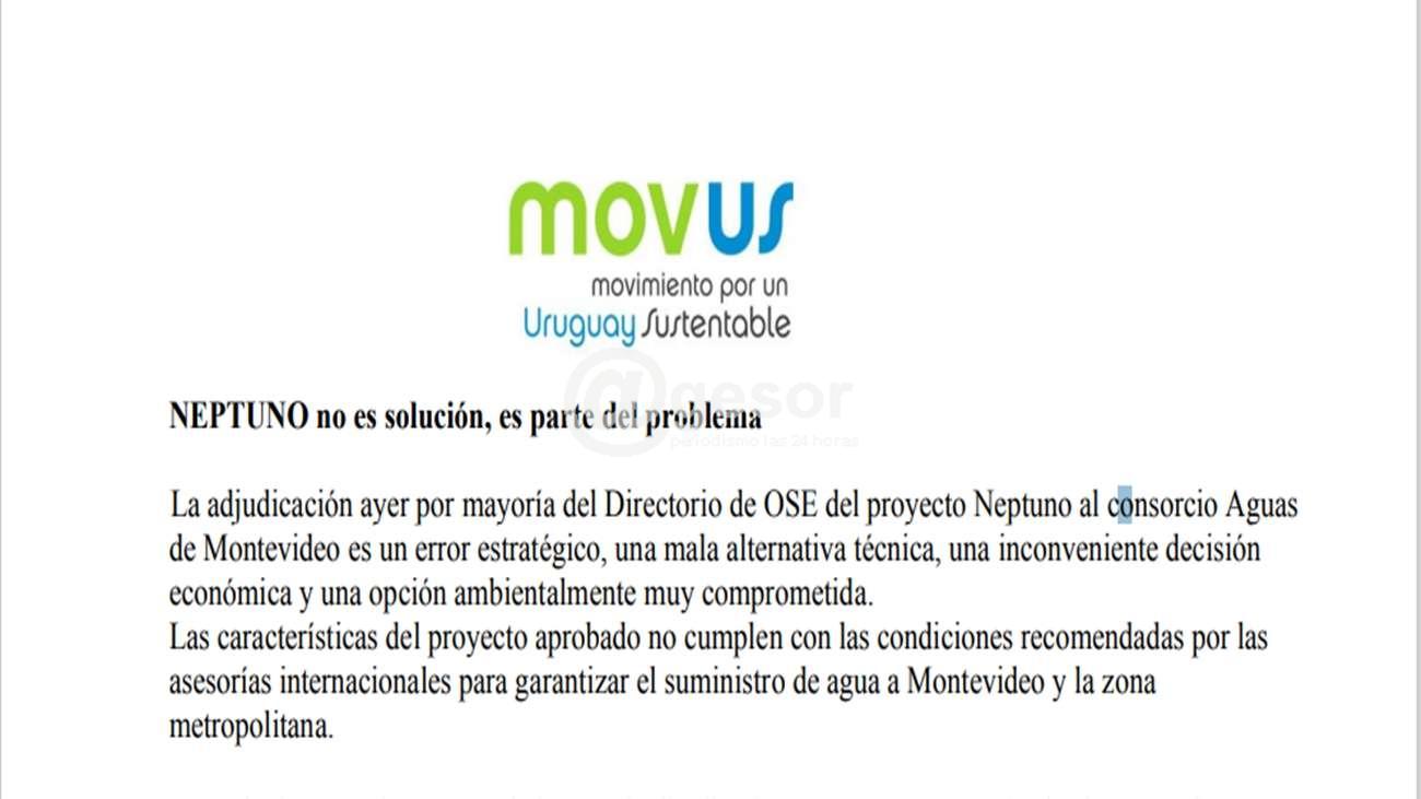 La profunda crisis hídrica que afectó al servicio de agua potable de Montevideo, generada a partir de una fuerte sequía que aún no ha terminado, puso de manifiesto la necesidad de mejorar el sistema de agua potable en el país y en tal sentido desde el MOVUS hemos presentado la propuesta de un diálogo nacional y la necesidad de encarar una serie de obra que son por su orden: