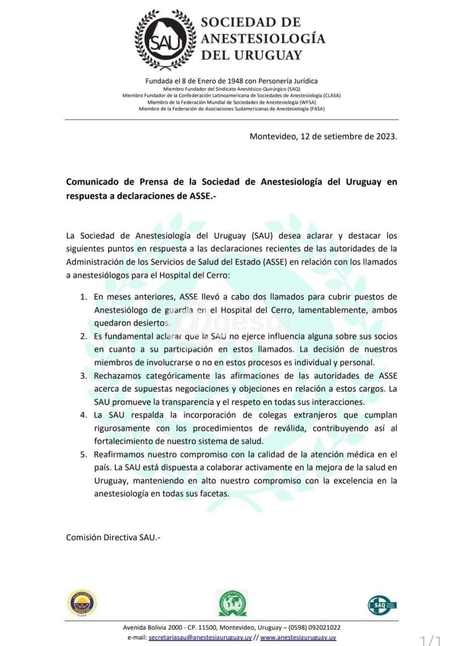 “La Sociedad de Anestesiología del Uruguay (SAU) desea aclarar y destacar los siguientes puntos en respuesta a las declaraciones recientes de las autoridades de la Administración de los Servicios de Salud del Estado (ASSE) en relación con los llamados a anestesiólogos para el Hospital del Cerro”: