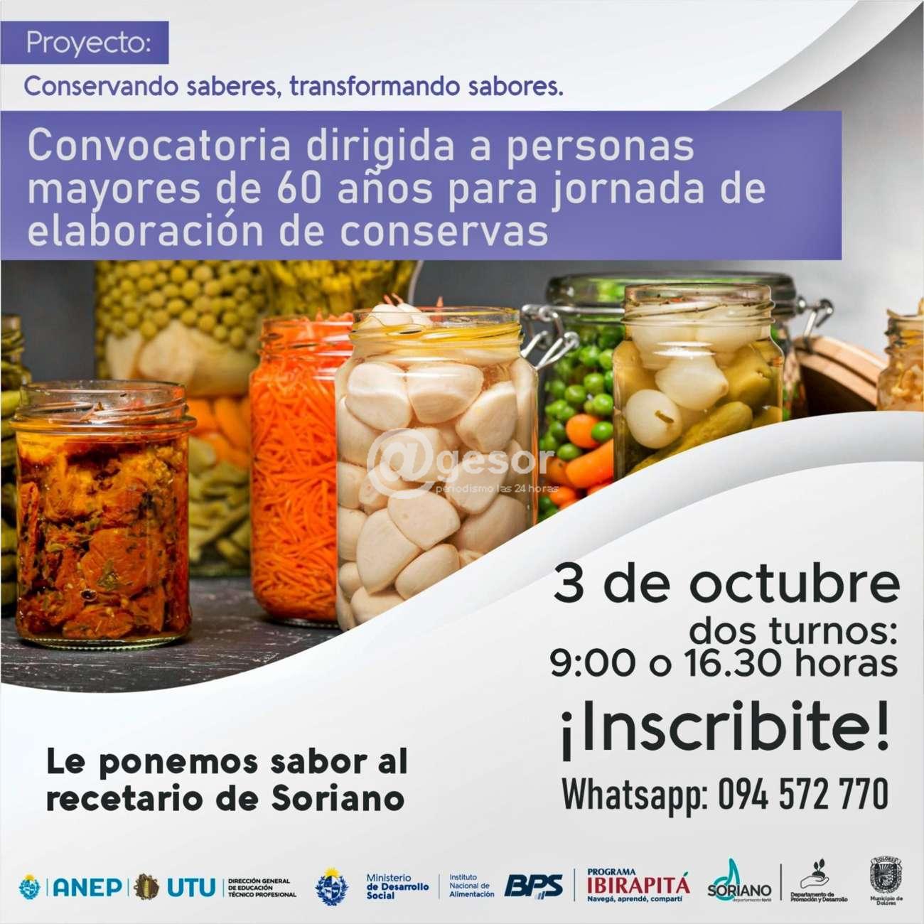 Residís en Dolores, tenés más de 60 años y te gustaría participar de una jornada de elaboración de conservas junto a estudiantes de Gastronomía de UTU... ¡esta propuesta es para vos!