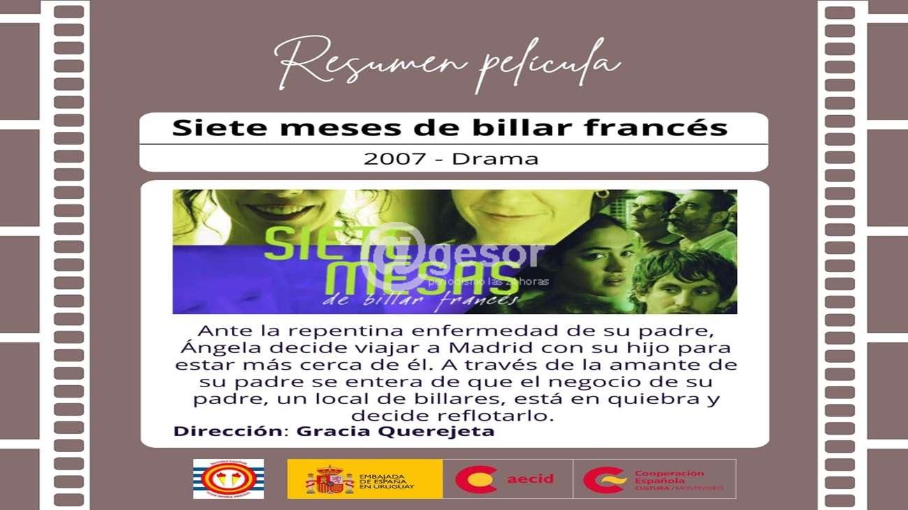 Este jueves 21 de setiembre en el Hogar Español se realizará una nueva velada de Cine. Esta semana se proyectará la película "Siete meses de billar francés", un drama de año 2007.