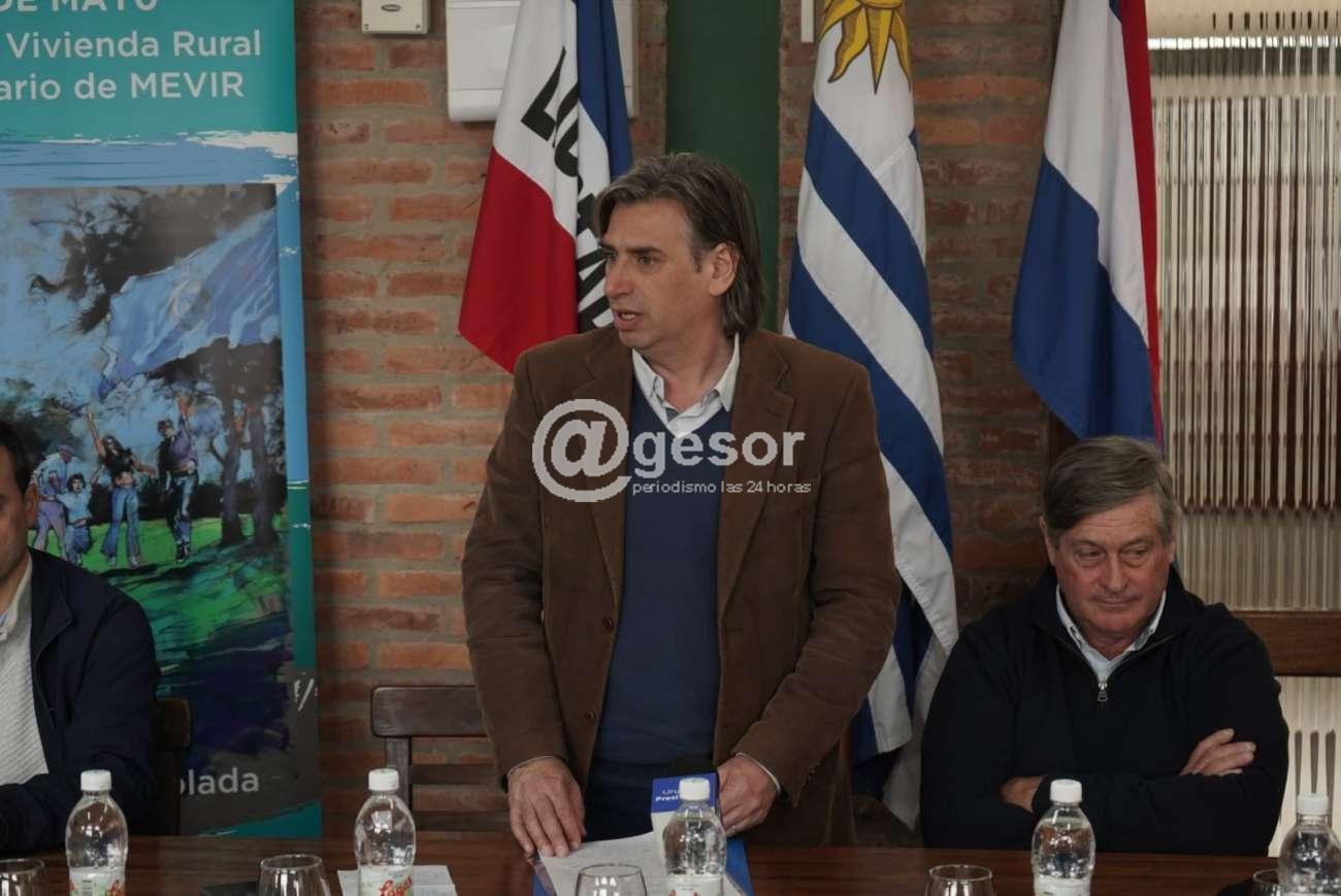 Delgado añadió, "hoy nos juntamos porque hace ocho o diez meses hicimos el anuncio que estábamos dispuestos a venir a Palmitas, que teníamos los rubros, y que íbamos a hacer un plan de viviendas disperso en planta urbana y medio rural, y otro nucleado. Ya se hicieron los llamados para los dos, están las familias inscriptas, estamos en proceso de selección, el nucleado va a ser el sorteo el próximo mes viene muy avanzado. Una tierra que donaba la Intendencia, acá tenemos el certificado notarial de la compraventa firmada por predio de 5 has que se cambia a categoría urbano por los requerimientos legales lo que permite que MEVIR pueda construir acá un plan nucleado de aproximadamente 55 viviendas".
