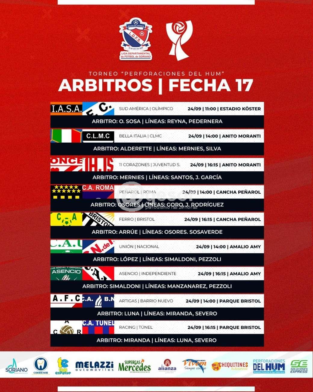 El Colegio de Arbitros de la Liga Departamental de Fútbol de Soriano, dio a conocer las ternas que estarán conduciendo los encuentros de la 17ª fecha del Clasificatorio "Perforaciones del Hum" del fútbol mercedario en primera división.