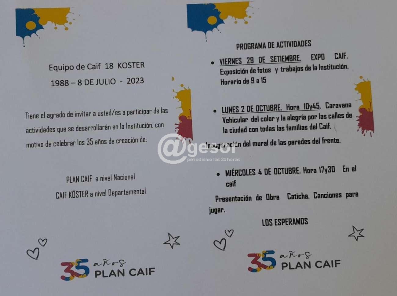 En el caso del CAIF 18 del Köster las actividades se inician este viernes 29 de setiembre con exposición de fotos y trabajos de la institución en jornada que irá de 9.00 a 15.00 horas.