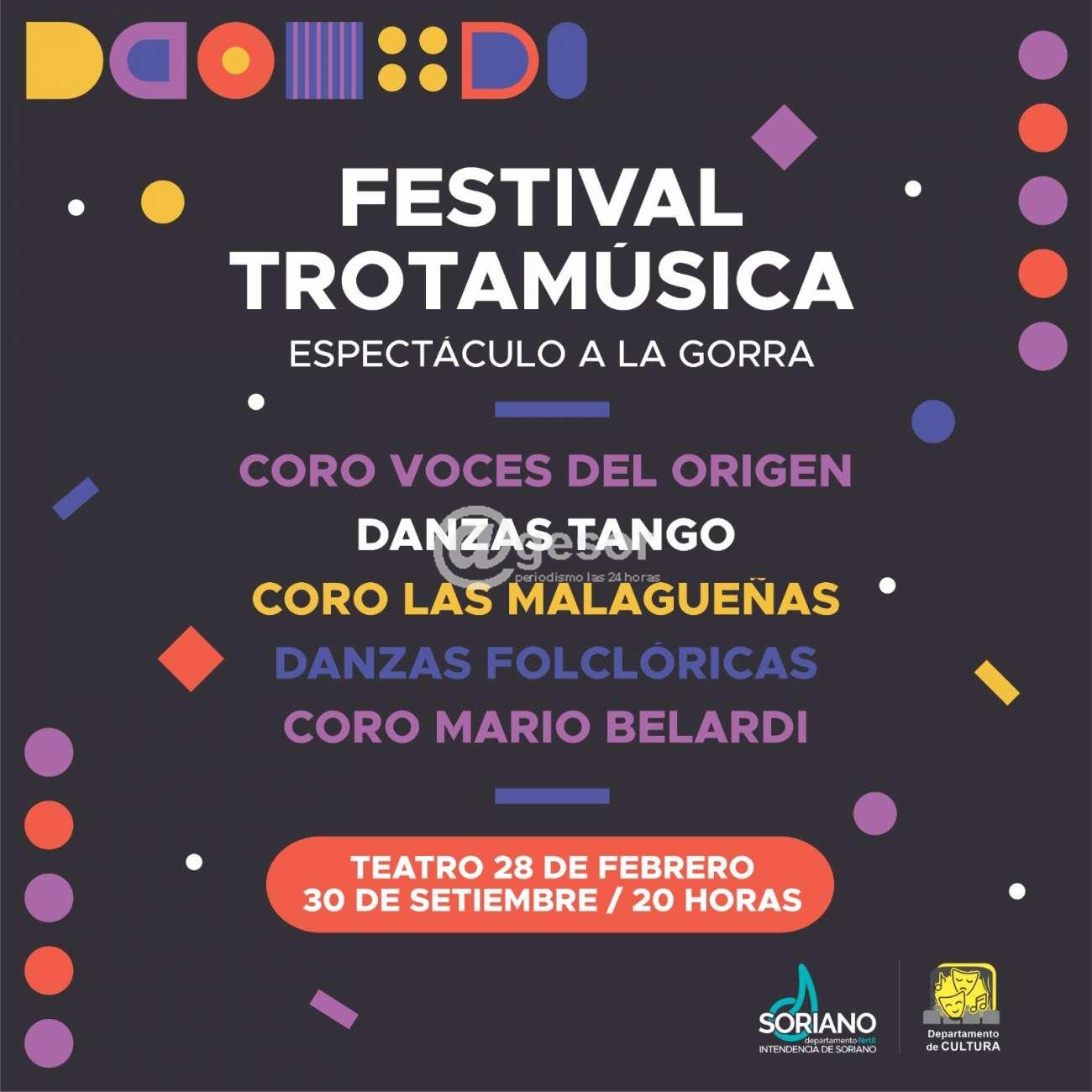 Este sábado 30 de setiembre en el teatro 28 de Febrero de Mercedes se lleva a cabo Festival Trotamúsica, un espectáculo a la gorra, a partir de las 20.00 horas, con la participación de: Coro Voces del Origen, Danzas Tango, Coro Las Malagueñas, Danzas Folclóricas y Coro Mario Belardi.