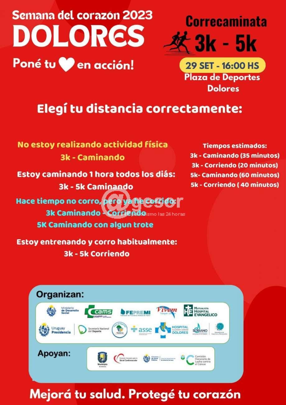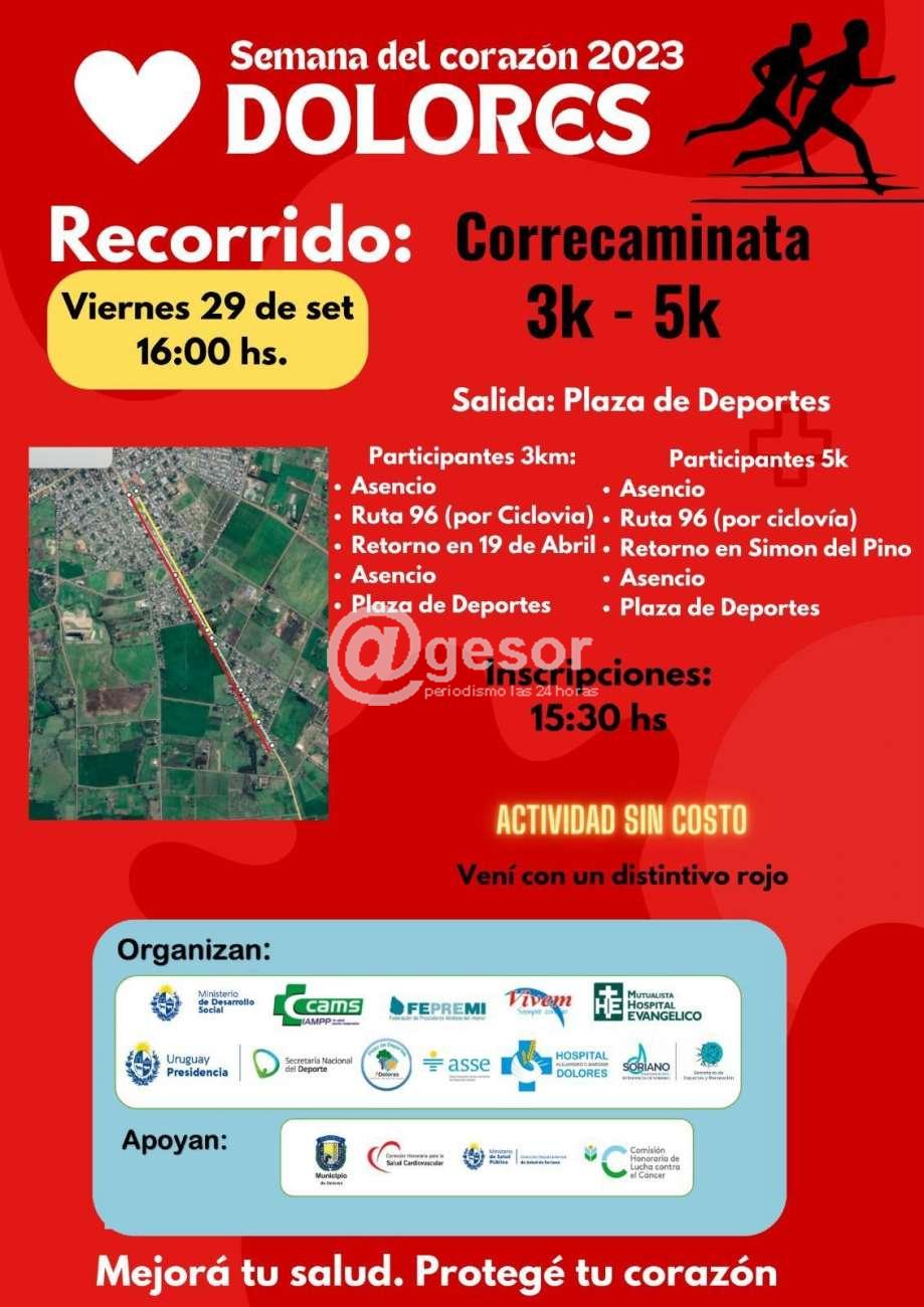 Este viernes 29 de setiembre, en el marco de la Semana del Corazón desde las 16.00 horas en Dolores, se realiza Correcaminata de 3k y 5k con punto de salida desde la plaza de Deportes, invitándose a los participantes a concurrir con distintivo de color rojo.
