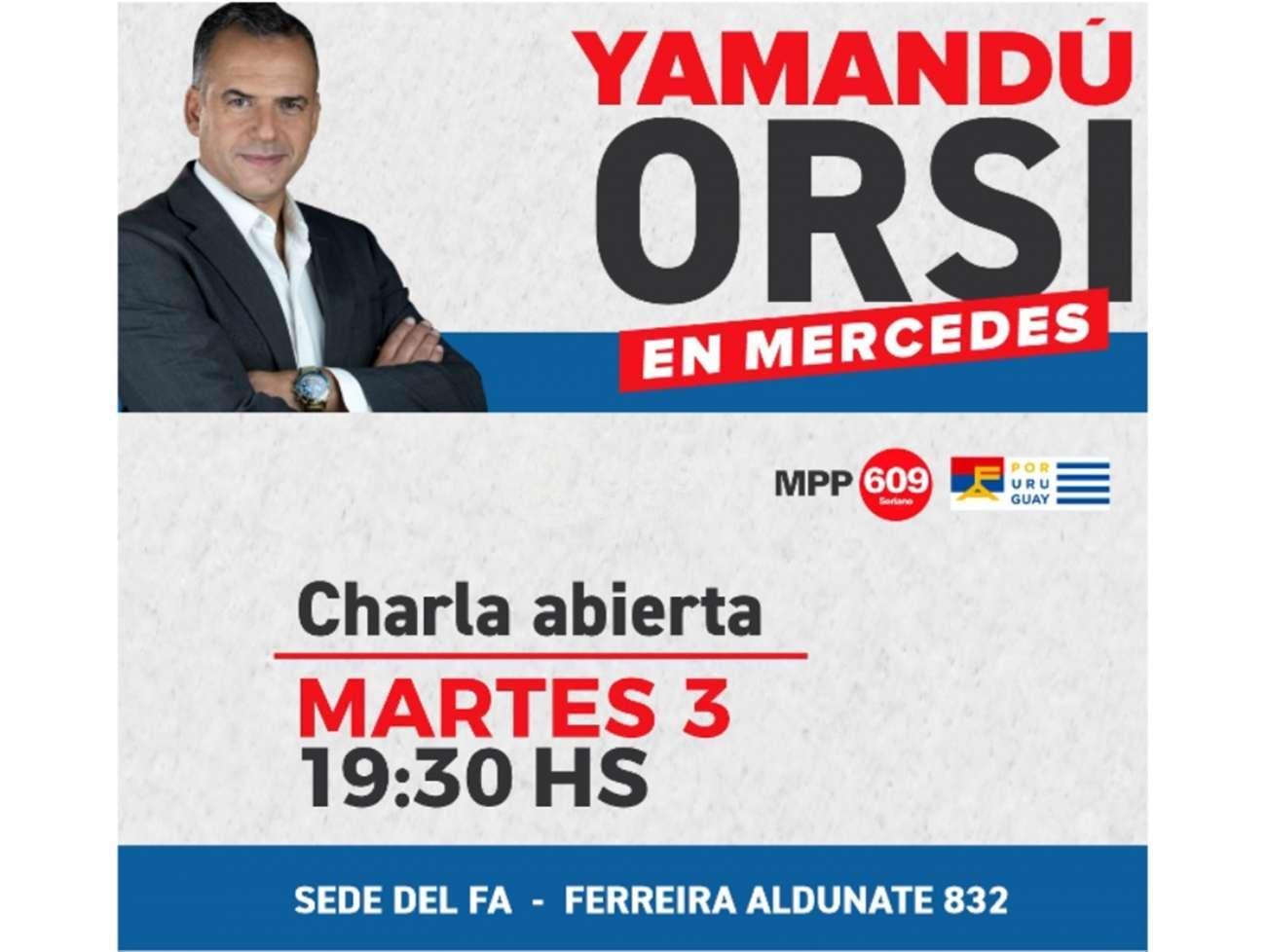 Este martes 3 de octubre estará desarrollándose charla abierta a las 19.30 horas en Sede de la Departamental del Frente Amplio con la presencia de YAMANDÚ ORSI en Mercedes para dialogar con los frenteamplistas y con los ciudadanos en general que deseen escuchar a quien seguramente sea uno de los precandidatos de la fuerza política de cara a las Internas del año próximo, cuando el diciembre el Congreso frenteamplista determine quienes serán los precandidatos.