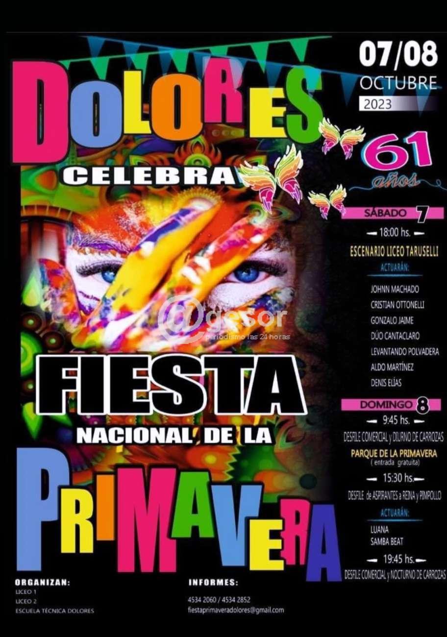 Durante este sábado 7 y domingo 8 de octubre estará desarrollándose la Fiesta Nacional de la Primavera con la organización del Liceo 1 "Roberto Taruselli", del Liceo 2 "Juan B. Herrero", Escuela Técnica de Dolores, habíandose conocido parte de la programación que se llevará a cabo durante estos dos días en cuanto a la parte de artistas que estarán actuando en los escenarios.