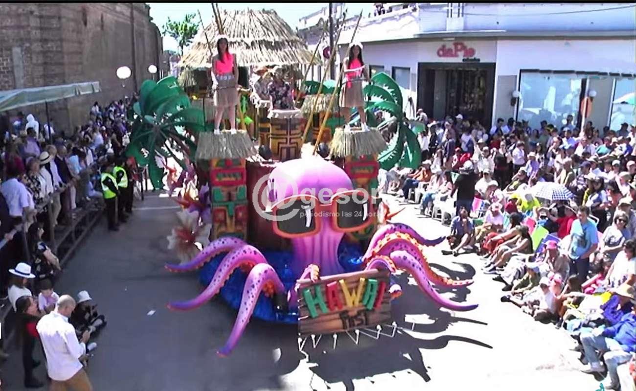 CARROZA N° 3 "Hawaii Fest" de los octavos unidos Liceo N° 1 "Dr. Roberto Taruselli", adelantan "y el recuerdo de aquella fiesta era inevitable, el hombre, la arena y el mar parecían fundirse en la danza a un alocado ritmo.
