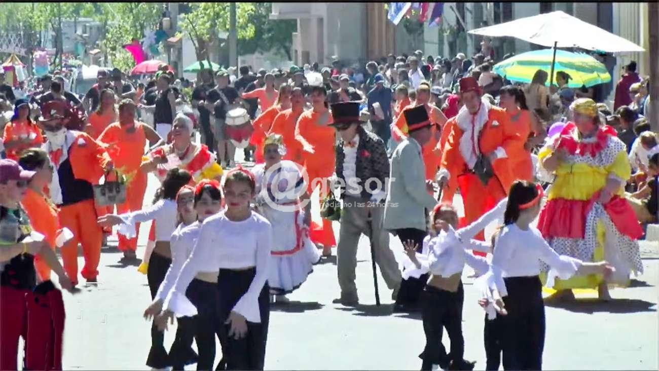 Ambos desaparecidos físicamente en el último año y fueron homenajeados con el lanzamiento de globos blacos y el aplauso generalizado de la gente que pobló el recorrido, para posteriormente dar comienzo al desfile comercial, y la presentación de uno de los símbolos del Carnaval doloreño la comparsa lubola 7 y 3 del Puerto con sus lonjas sonando en la apertura, brindando un muy buen espectáculo, para luego sí dar paso al pasaje de las carrozas que se inició con una carroza histórica que fue reciclada, que no se utilizaba hace muchos años y lució notable con la Reina y Pimpollo del año anterior y luego si los carros alegóricos volvieron a mostrar un muy buen nivel en su confección, el ingenio y la capacidad creativa, este año con más énfasis también en las coreografías, con mucha alegría, color y ritmo, un desfile brillante que se apreció al mediodía con la expectativa de otro tipo de lucimiento en la noche con los efectos que podrá mostrar cada uno de los carros.
